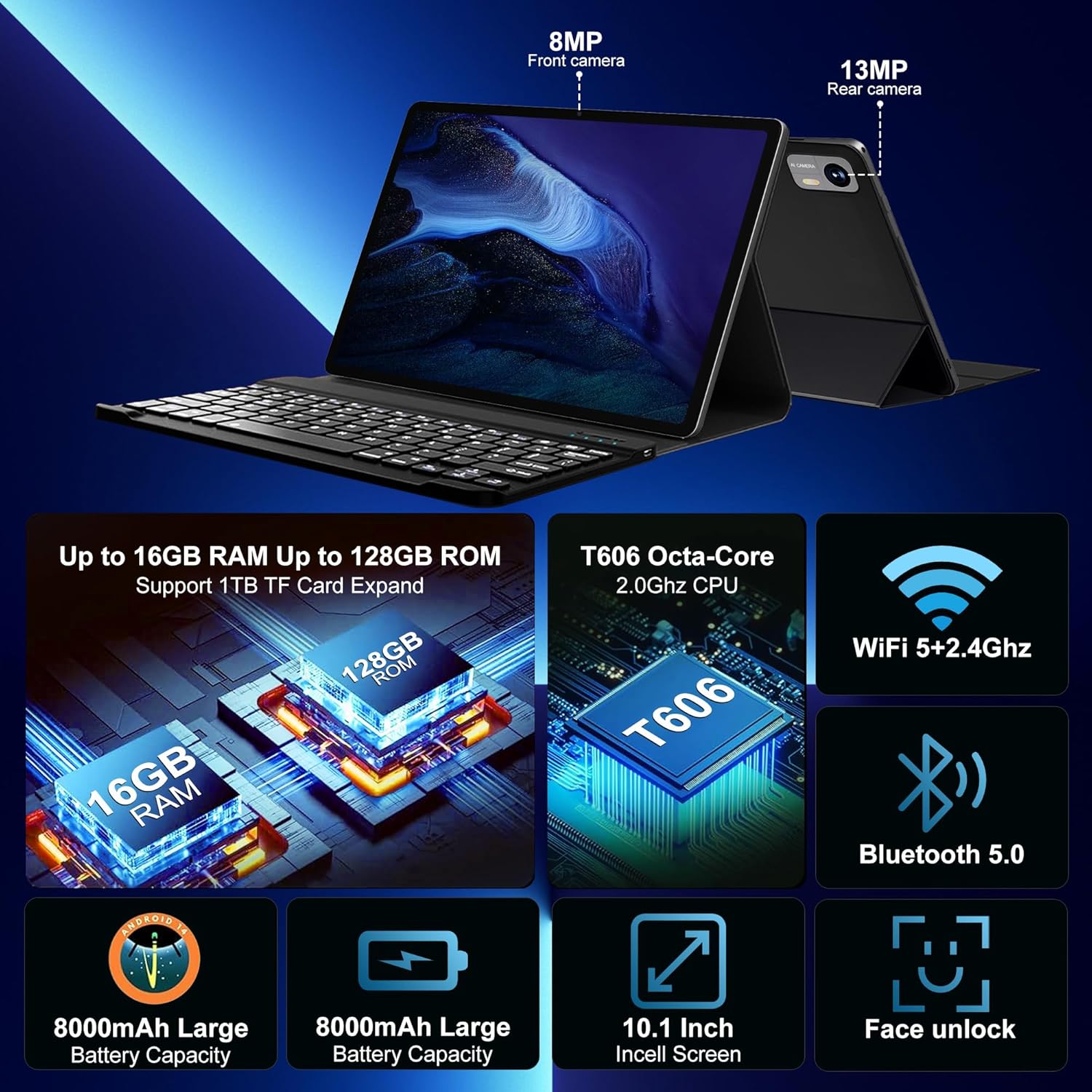 Android 14 Tablet with Keyboard,16GB RAM 128GB ROM 1TB Expand, 8000mAh Battery, 10.1 Inch Tablet with 13MP+8MP Camera/Bluetooth/GPS/WiFi/HD Display (Dark Gray)