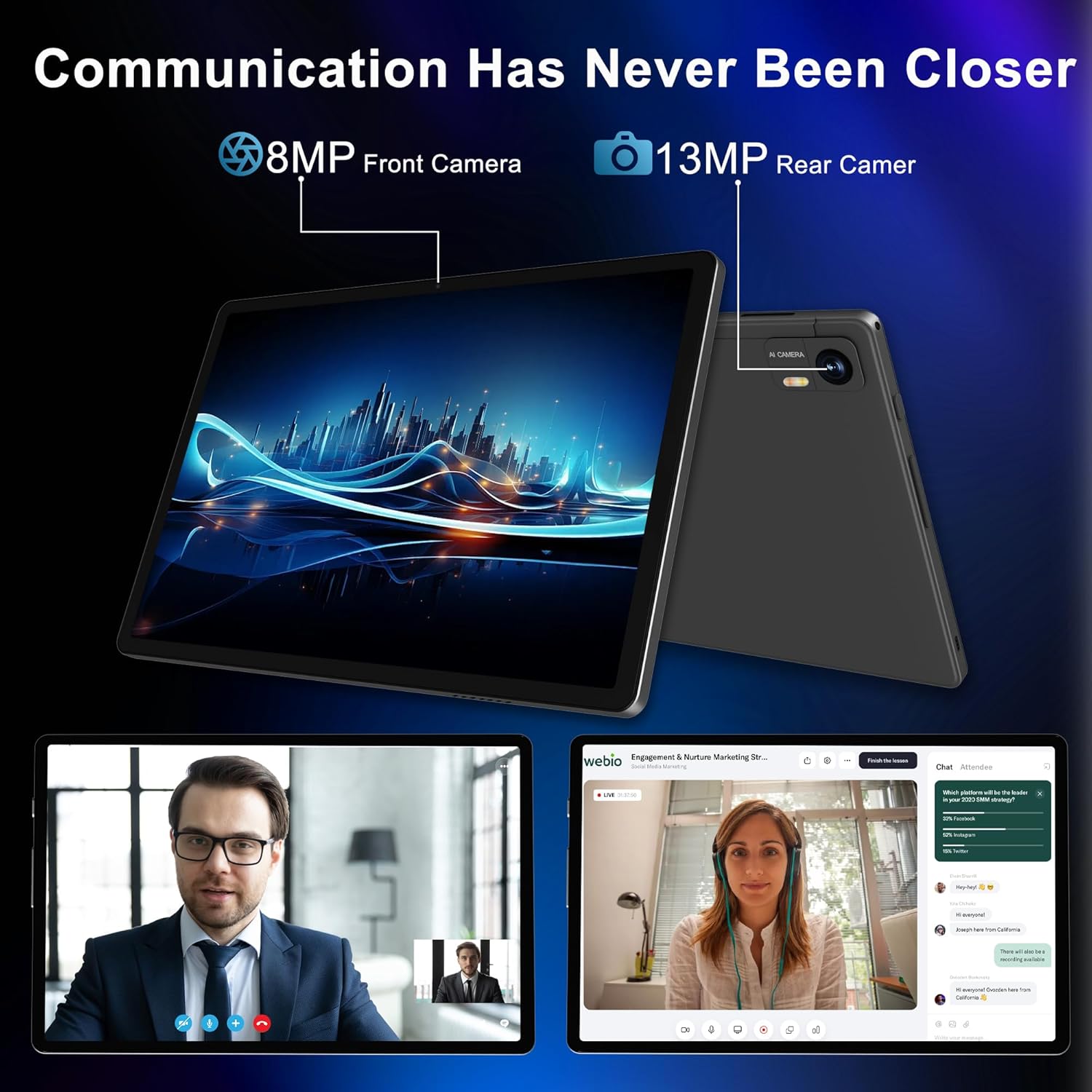 - 【Visual impact】This 10.1-inch tablet has an ultra HD screen, 1280x800 resolution, equipped with 13MP+8MP dual HD camera, for you to present a richer picture display, clearer portrait capture, the screen's soft light curtain can reduce the visual pressure on the eyes, relieve work fatigue.