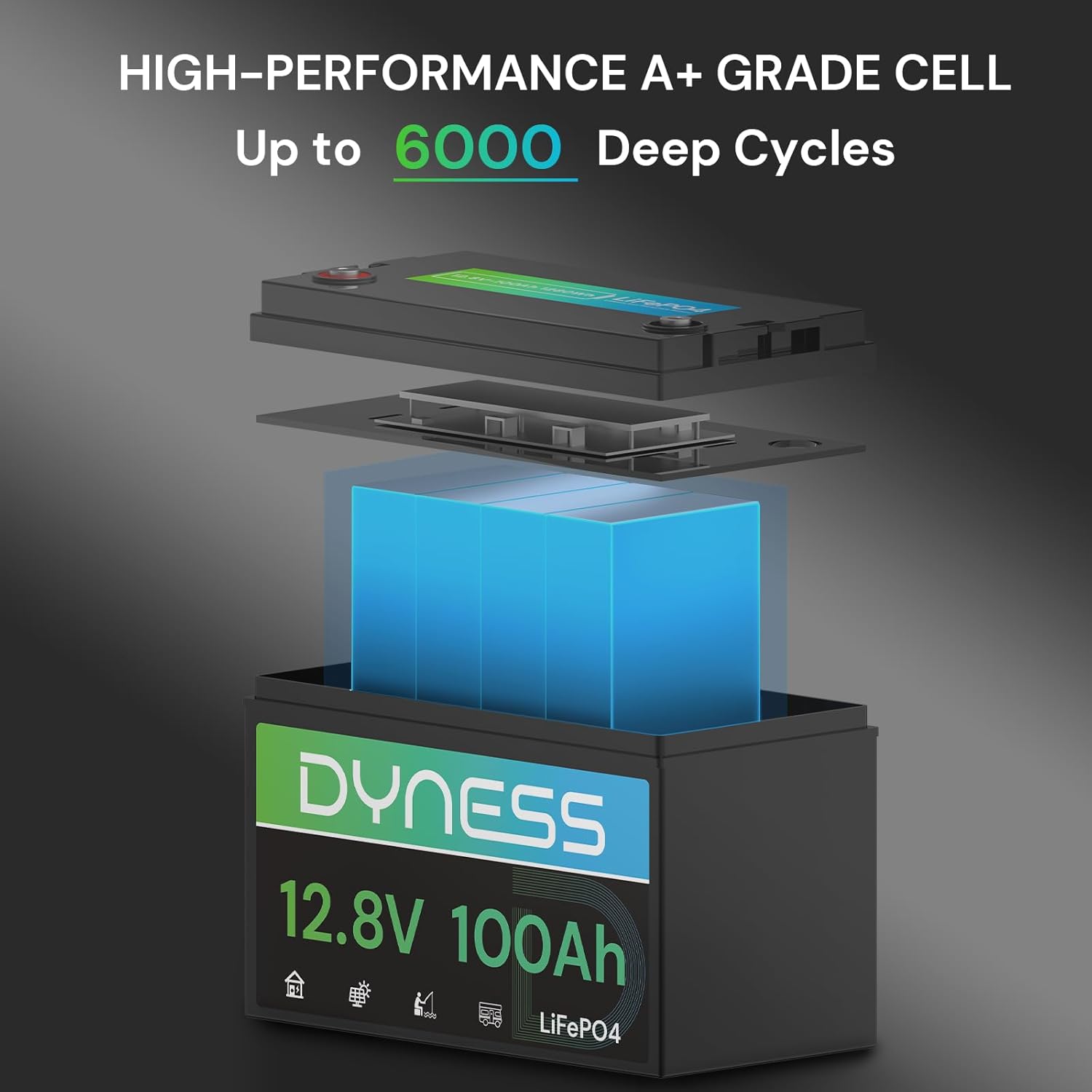 - 【Premium A+ Grade Cells & 6000+ Deep Cycles】Dyness 12V LiFePO4 Battery engineered with top-tier A-Grade LiFePO4 cells, which delivers exceptional longevity, higher power density, and inherent safety. Enjoy peace of mind with: ①10-Year Lifespan: Lasts up to 6X longer than standard lead-acid batteries.②Superior Energy Density: Packs 3-5X more power in the same space vs. traditional batteries.③Rigorous Safety Assurance: Independently tested and certified to global standards including UL, FCC, CE, RoHS, and UN38.3 for reliable operation. Each A+ grade battery cell is tested by a professional engineering team, so you can trace the production parameters of each cell