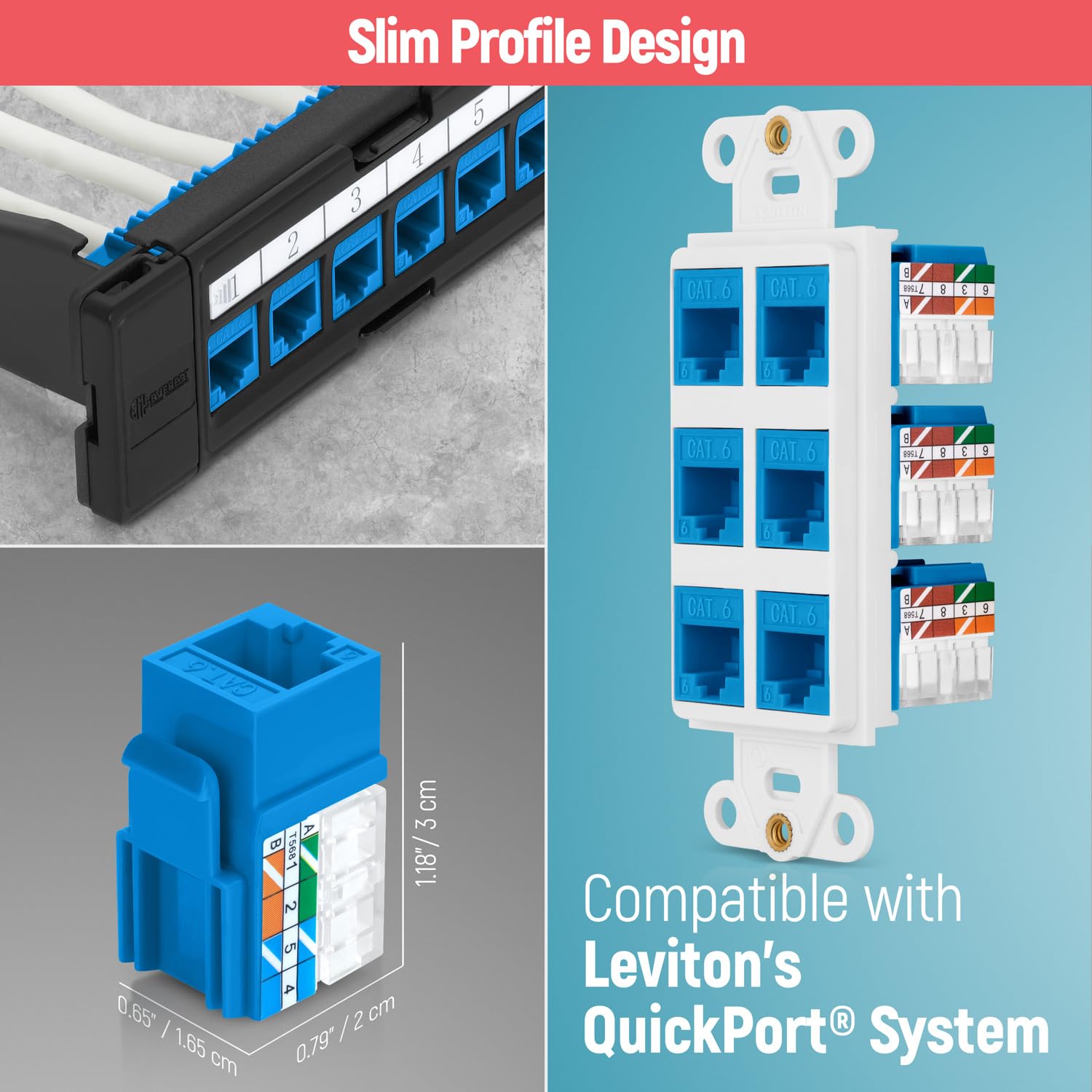 - Slim Profile Design - Can be used with a Keystone patch panel, wall plate, or surface mount box with standard or slim keystone blank openings. compatible with Leviton QuickPort System and slim Decora style wall plates