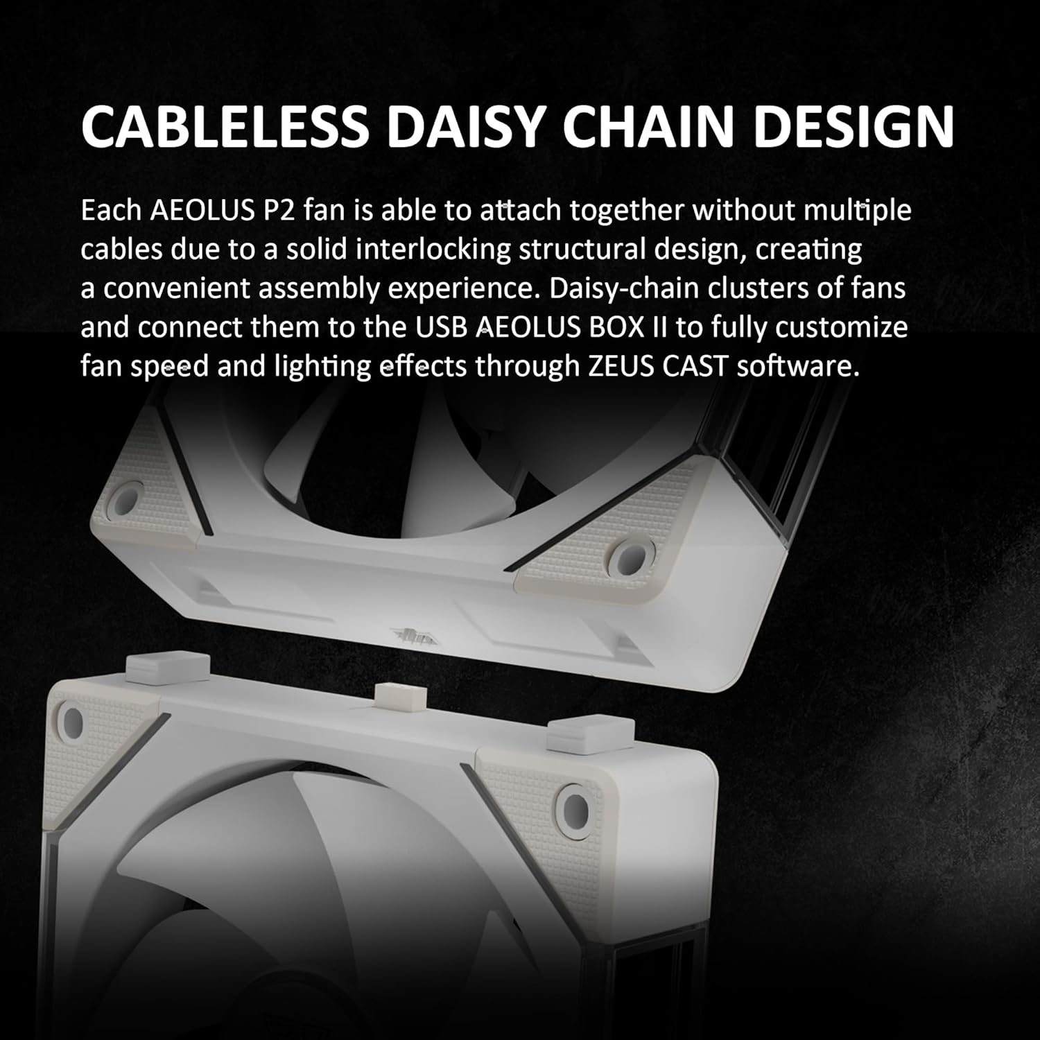 - Cableless Daisy Chain Design: AEOLUS P2 fans connect via interlocking frames—no extra cables needed. Link multiple fans and control lighting, speed, and effects through ZEUS CAST with the AEOLUS BOX II.