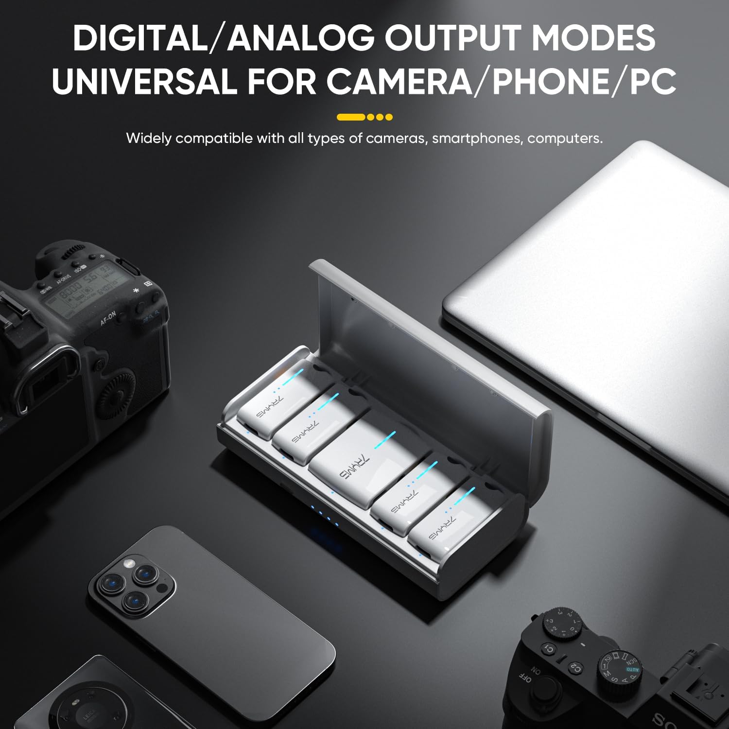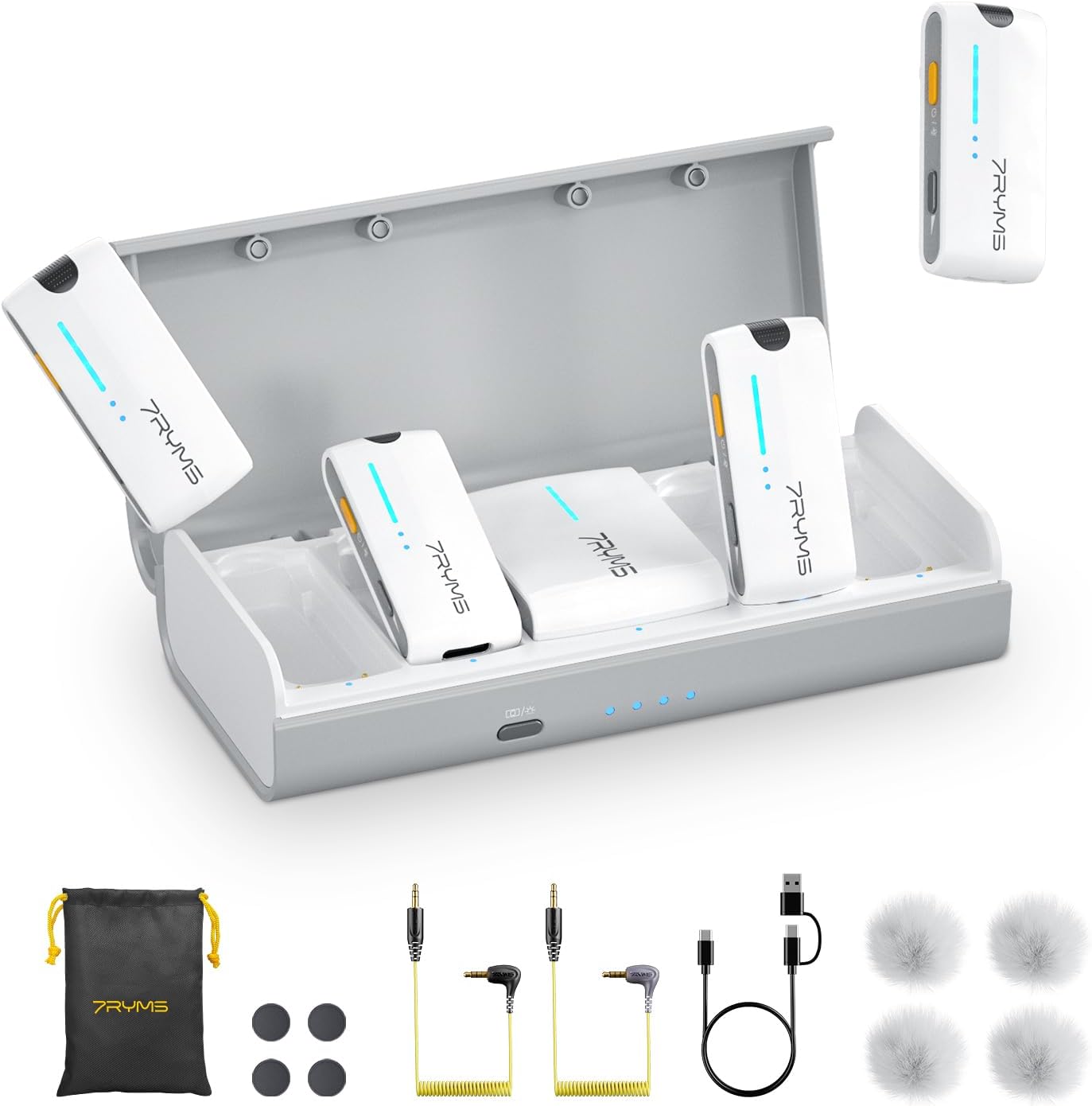 - Included Components : 2-in-1 Charging/Audio Output Cable*1, 3.5mm TRS-TRS Audio Cable*1;3.5mm TRS-TRRS Audio Cable*1, Charging Case*1; Carrying Pouch*1, Transmitter(TX)*4; Receiver(RX)*1, Wind Muff*4; Maqnetic Plate *4 2-in-1 Charging/Audio Output Cable*1, 3.5mm TRS-TRS Audio Cable*1;3.5mm TRS-TRRS Audio Cable*1, Charging Case*1; Carrying Pouch*1, Transmitter(TX)*4; Receiver(RX)*… See more