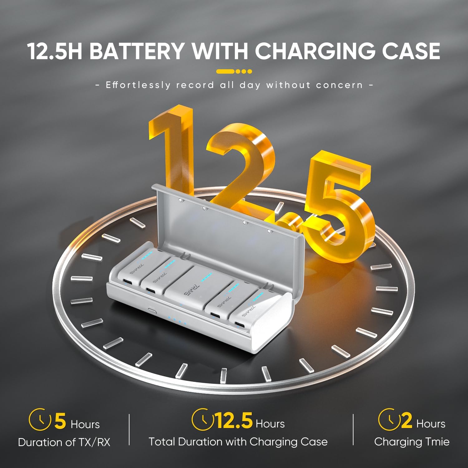 - 5 hours of operation on a full charge. With its compact charging case, you can recharge the entire set 1.5 times, with each full charge taking only 2 hours. This means that with the charging case, you can enjoy a total battery life of 12.5 hours. No more worrying about low battery situations