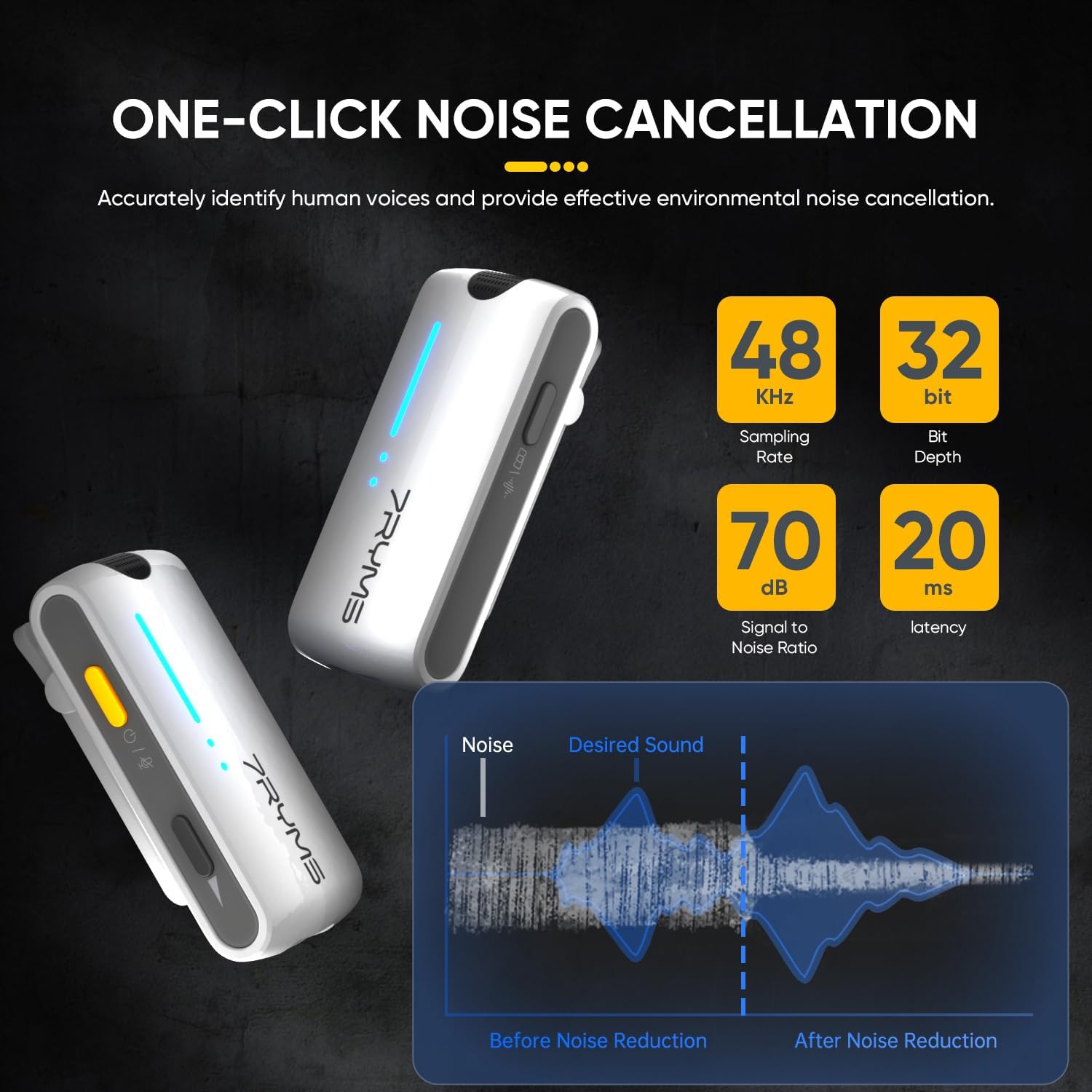 - One-Click Noise Cancellation: 7Ryms iRay DW40 wireless lavalier micophone allows easy one-click noise cancellation directly on the transmitter. Whether you’re recording in a noisy environment or outdoors, our advanced technology ensures clear and detailed sound by effectively isolating the original audio source.