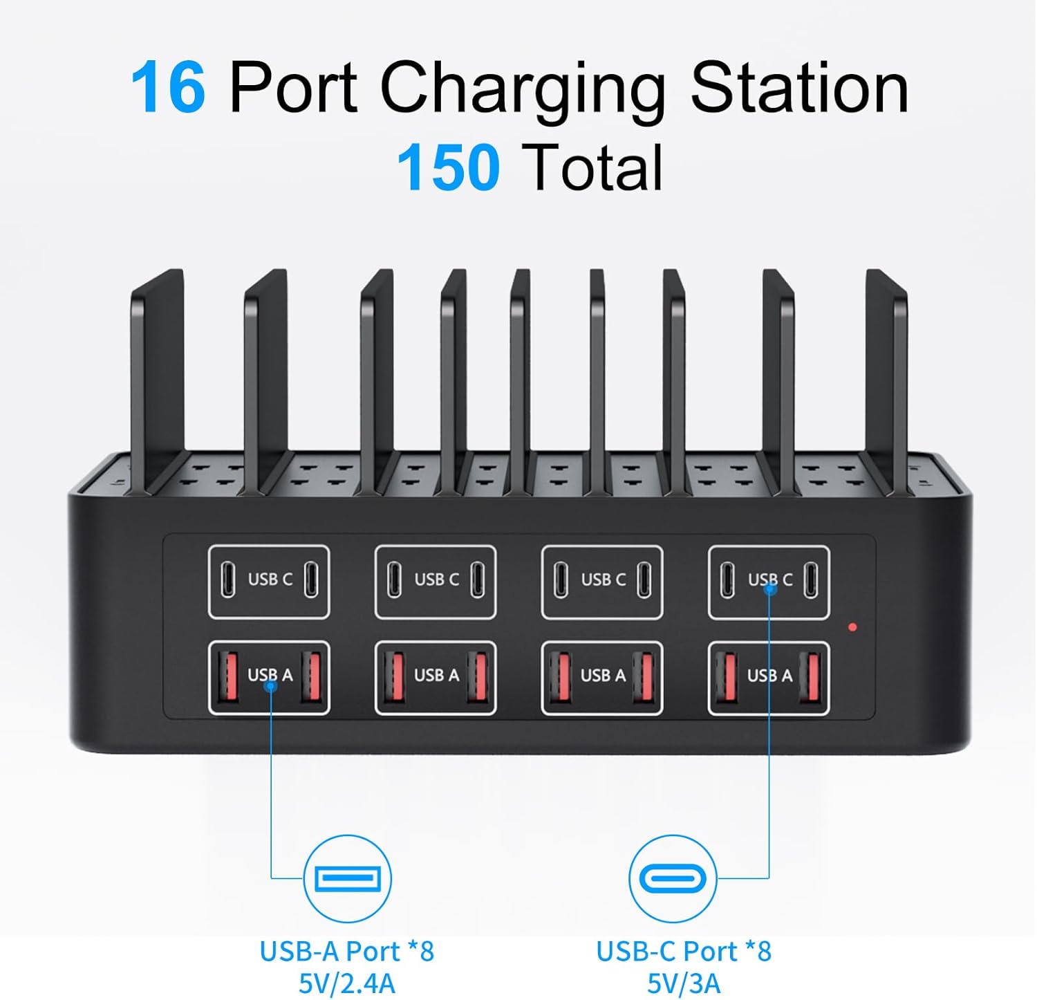 - [Declutter Your Space] The 150W 16-Port Charging Station is your ultimate solution for charging 16 devices simultaneously—perfect for busy households, offices, or tech-savvy users. With 8 USB-A ports and 8 USB-C ports, this powerhouse delivers a massive 150W total output, ensuring lightning-fast charging for smartphones, tablets, laptops, and more