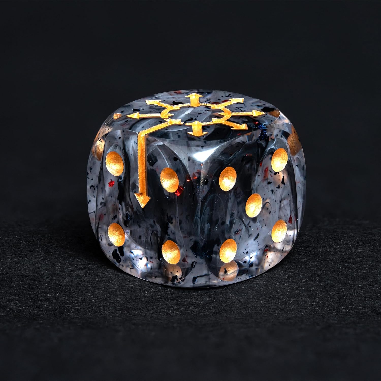- 💀 Warpforged Relics Each die is a swirling storm of black and white resin, supercharged with shards of red and black foil — like a daemon world mid-collapse. Topped with the Chaos Star, these cubes look like they were blessed by the Dark Gods themselves.