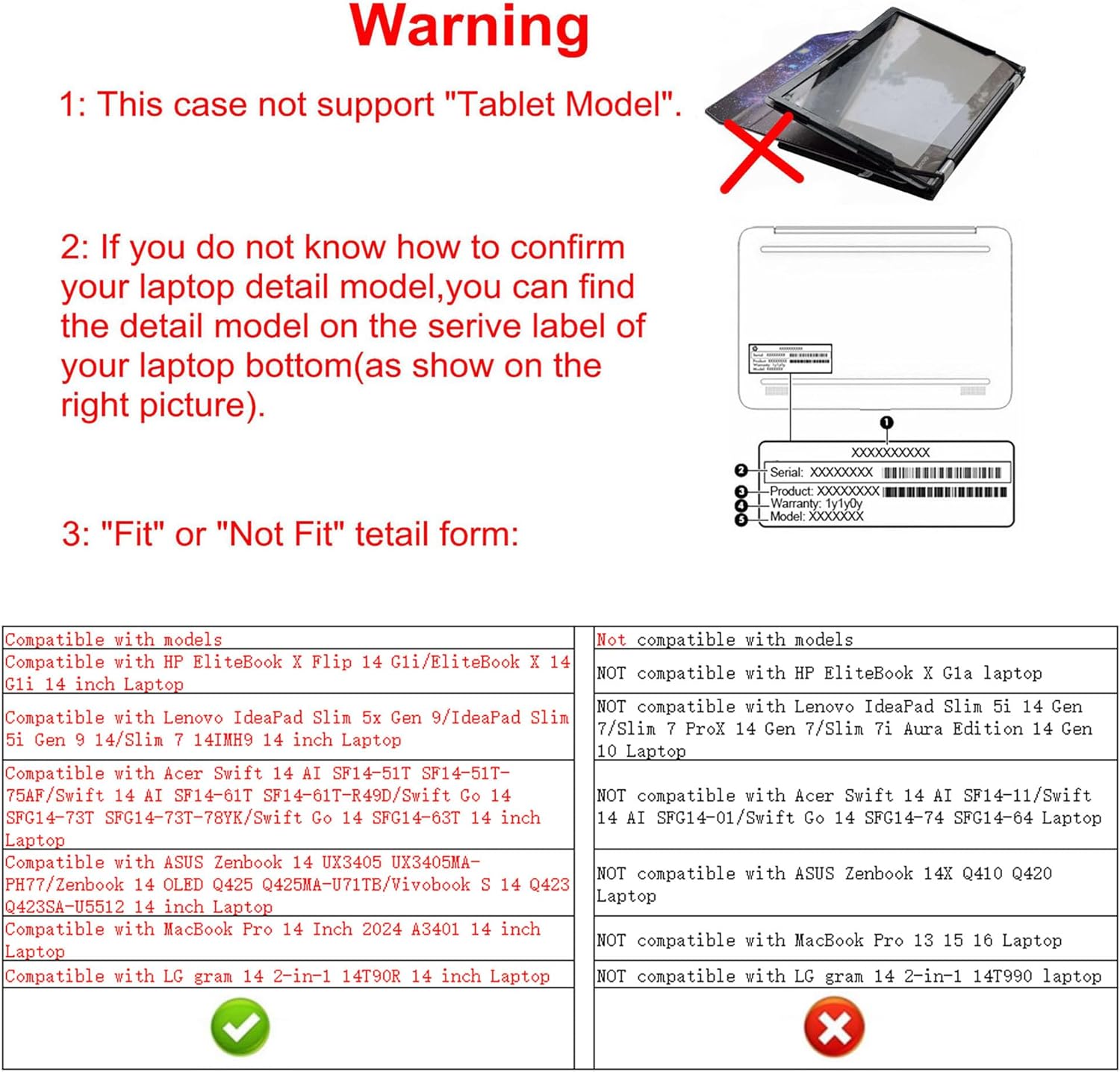 - Warning: Not compatible with HP EliteBook X G1a/EliteBook Ultra G1q/EliteBook Ultra 14 G1q8 and NOT compatible with Lenovo IdeaPad Pro 5i 14 Gen 7 and NOT compatible with Acer Swift 14 AI SF14-11T/Swift 14 AI SFG14-01 and Not compatible with ASUS Zenbook 14X OLED UX3404/Zenbook 14X Q410/Zenbook 14X Q420 and Not compatible with ACER SWIFT 3X 14 SF314-510G {{Warning:Most of returned because of choosing wrong model,please confrim your laptop model}}.