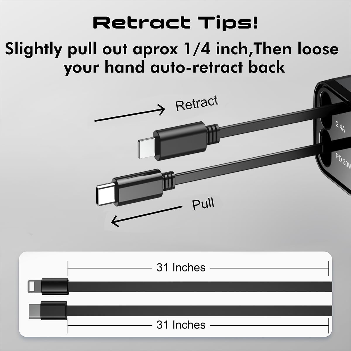 - 【4 in 1 Retractable Design – Say Goodbye to Cable Mess】 Built with 2 retractable charging cables (USB C + Lightning) and 2 ports (USB C + USB A), this charger powers up to 4 devices at once. Clean, tangle-free design perfect for on-the-go use