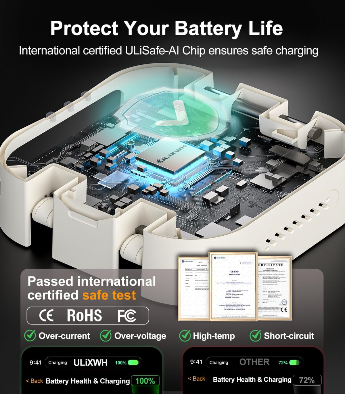 - 【Safety Certs Chip, Safer, Faster】 After 3 years of over 168 component tests and 158 times algorithm optimization, we have developed our groundbreaking ULi-Safe Ai CHIP (Exclusive Patent). Passed overcurrent, overvoltage, short circuits and over-temp tests in international certs laboratories (CE, FCC, ROHS... ), apple magsafe charger charging speed is 1.6 times that of others, and safety is 2.2 times. iphone magnetic charger station ensures decive safe and fast charging, protects battery life