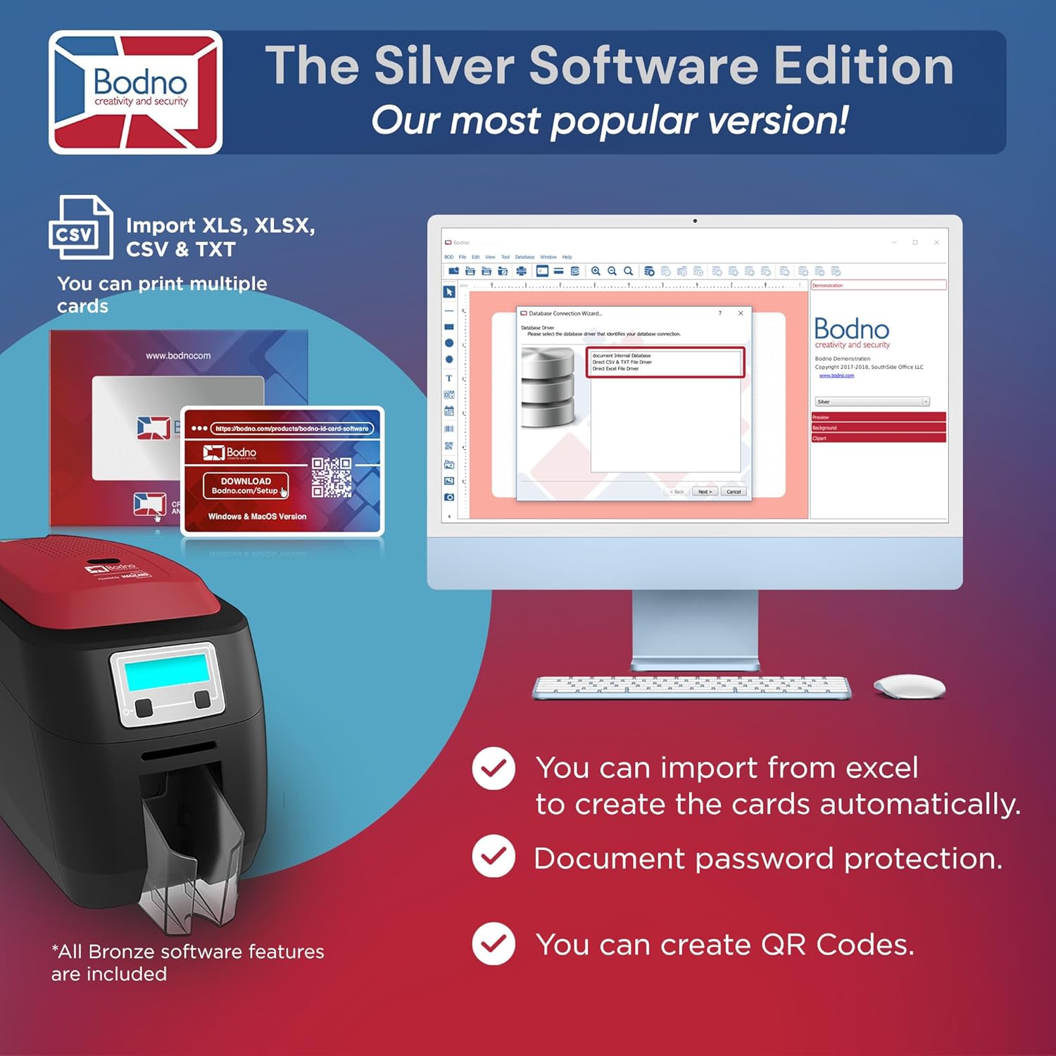 - BODNO SILVER EDITION WITH LIFETIME LICENSE: Expands on Bronze features by adding functionality to auto-create cards from Excel or CSV files, enhancing productivity.