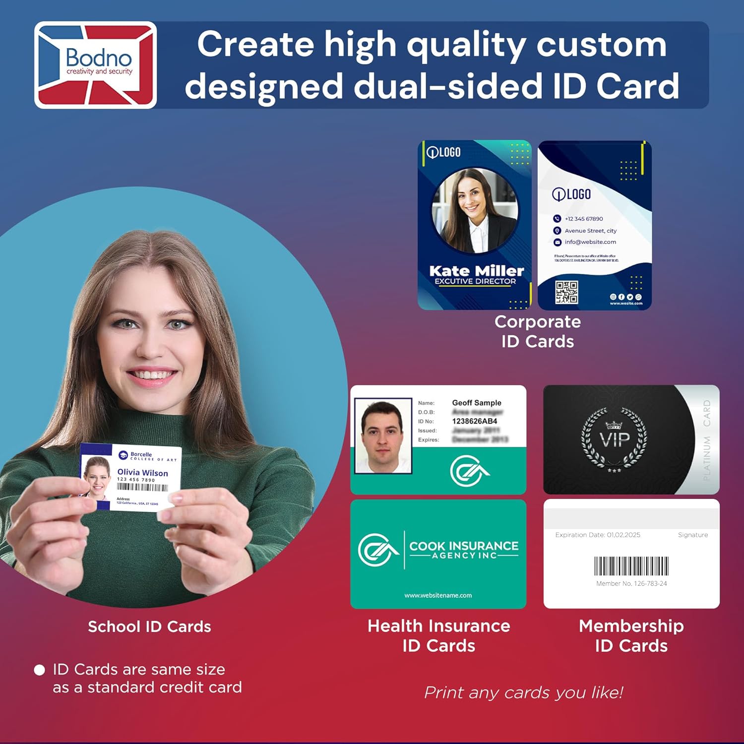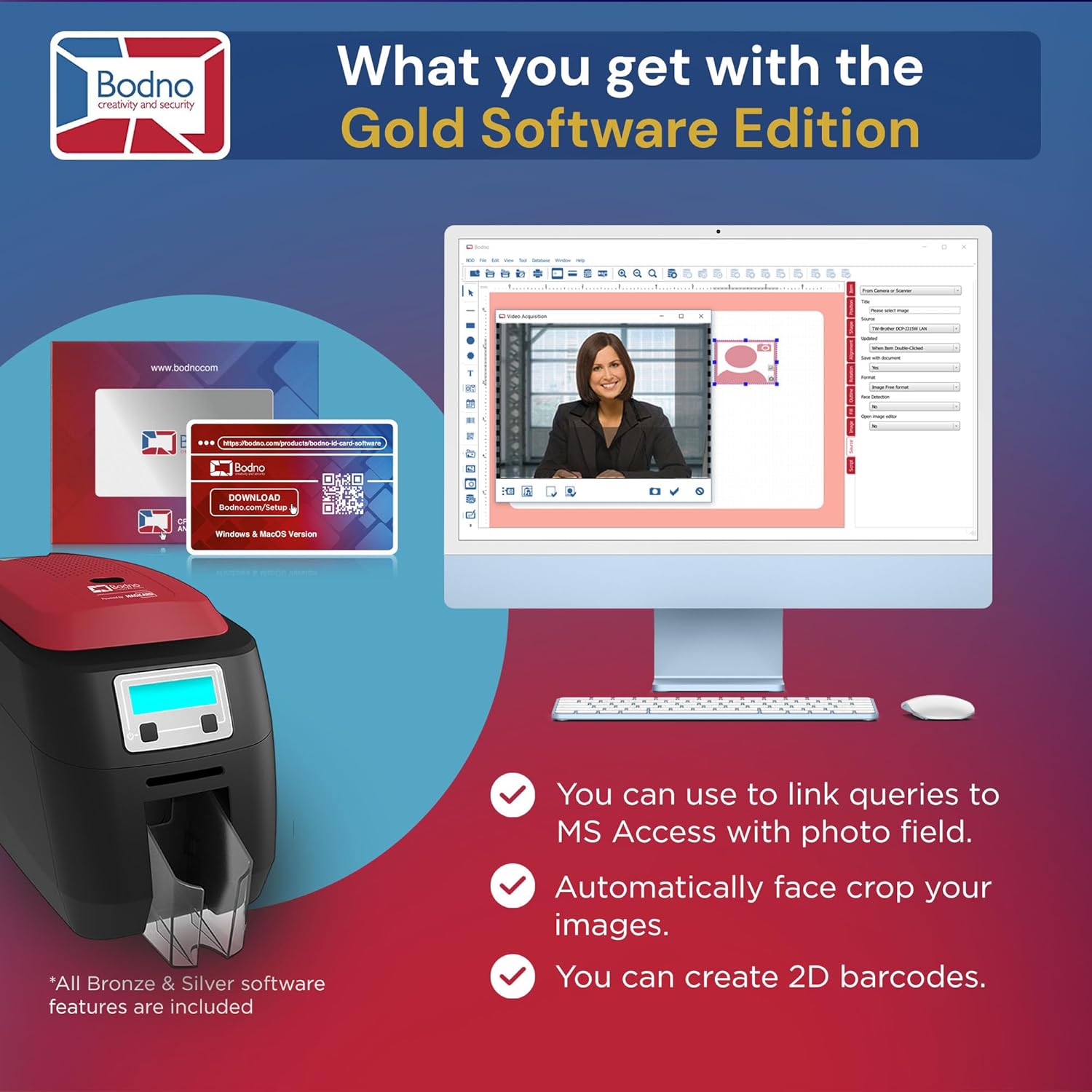 - BODNO GOLD EDITION WITH LIFETIME LICENSE: Advanced features include 2D barcode printing, automatic face cropping, and seamless integration with MS Access and SQLite databases.