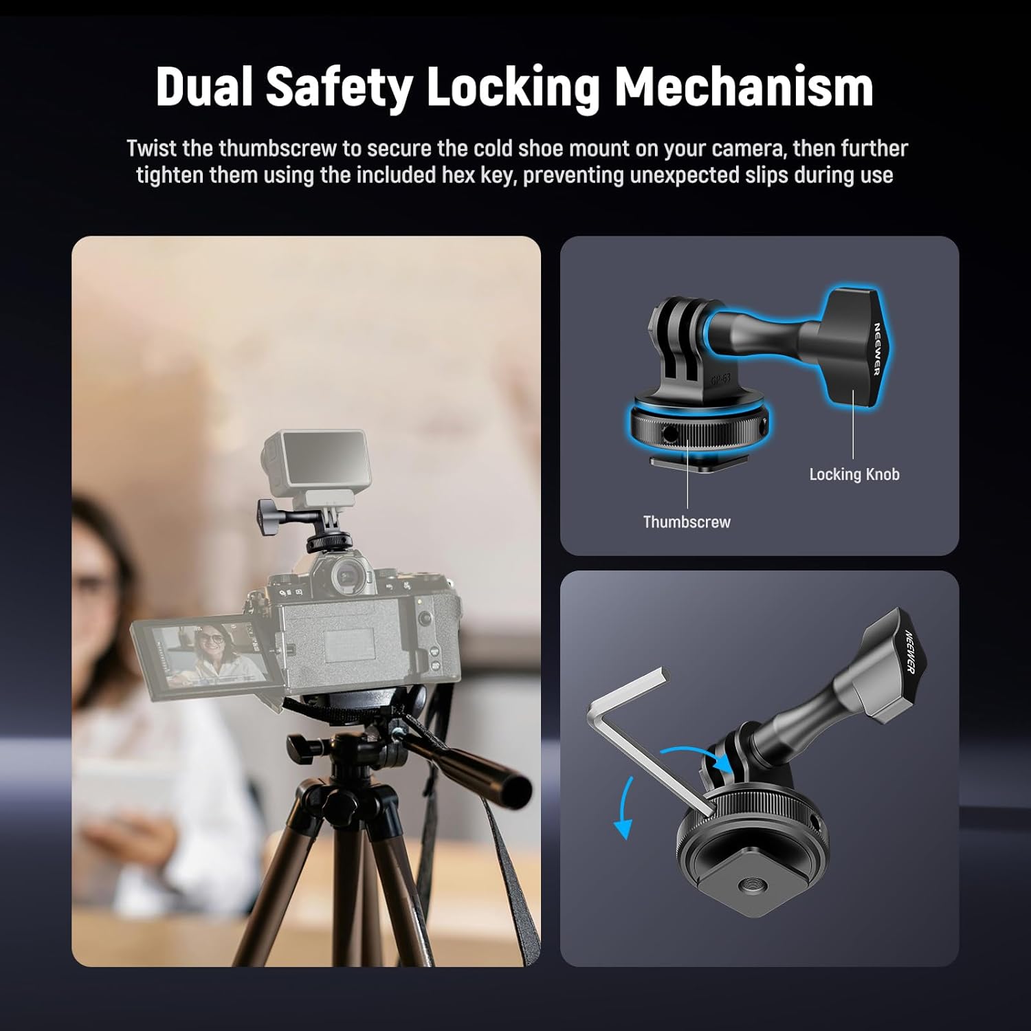 - 【Dual Safety Locking Mechanism】 Twist the thumbscrew to secure the cold shoe mount on your camera, then further tighten them using the included hex key, preventing unexpected slips during use