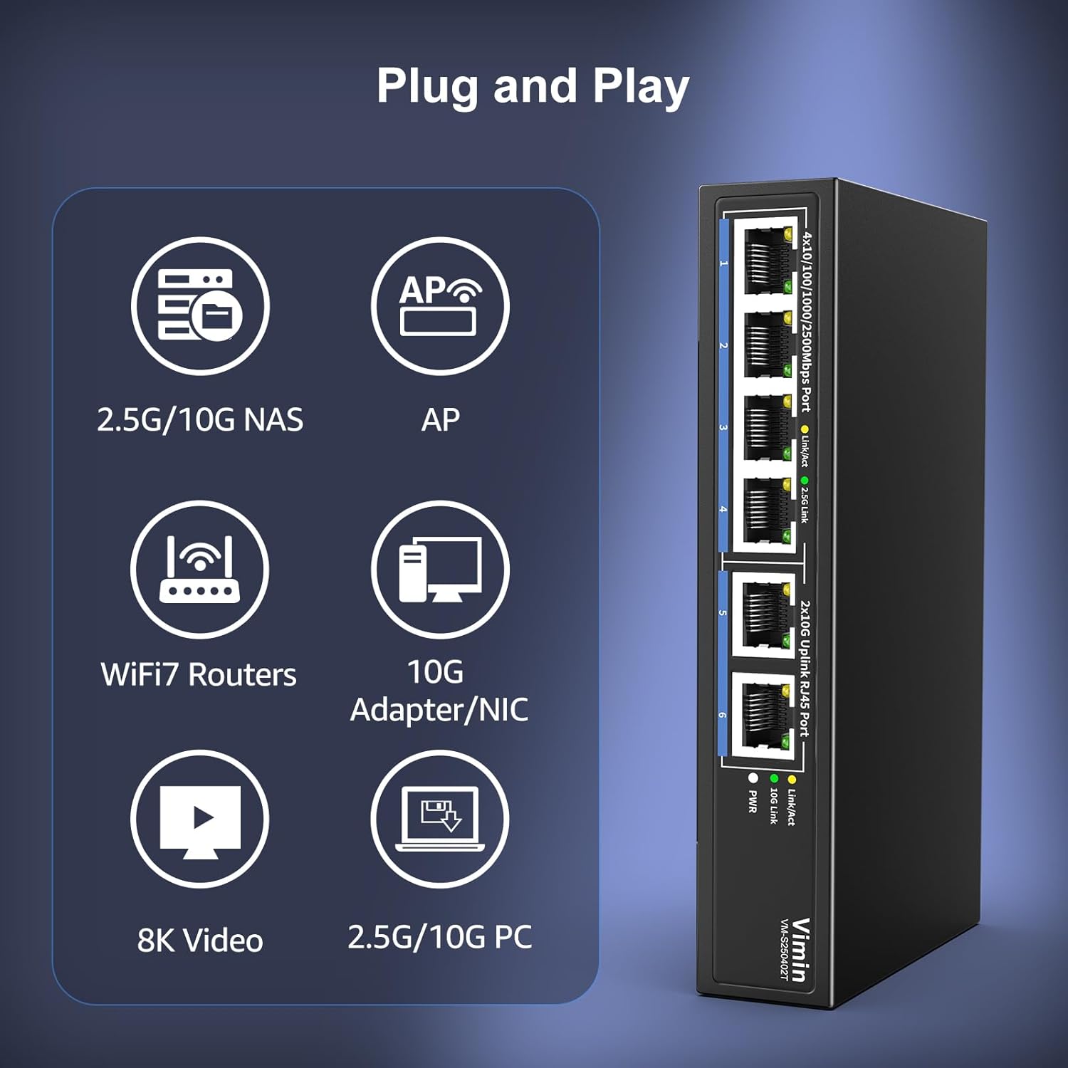- ✓ Plug & Play Network Switch - Auto-MDI/MDIX with dynamic LED indicators enables instant deployment - simply connect CAT6A cables for instant 10Gbps uplink without complex configurations.