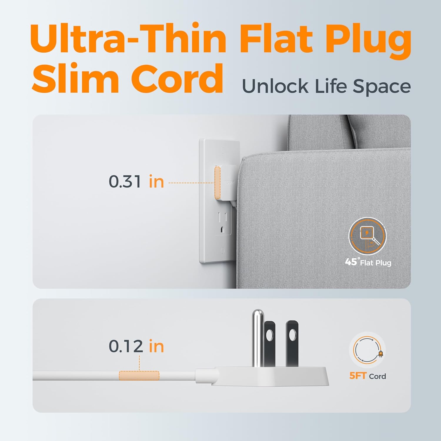 - Flat Extension Cord 5FT: Featuring an ultra 0.31in flat head design, this extension cord flat wall plug can fit in tight spaces and hide the behind sofa, and other furniture; 45 degree angle design creates an extra space for other plug below without blocking