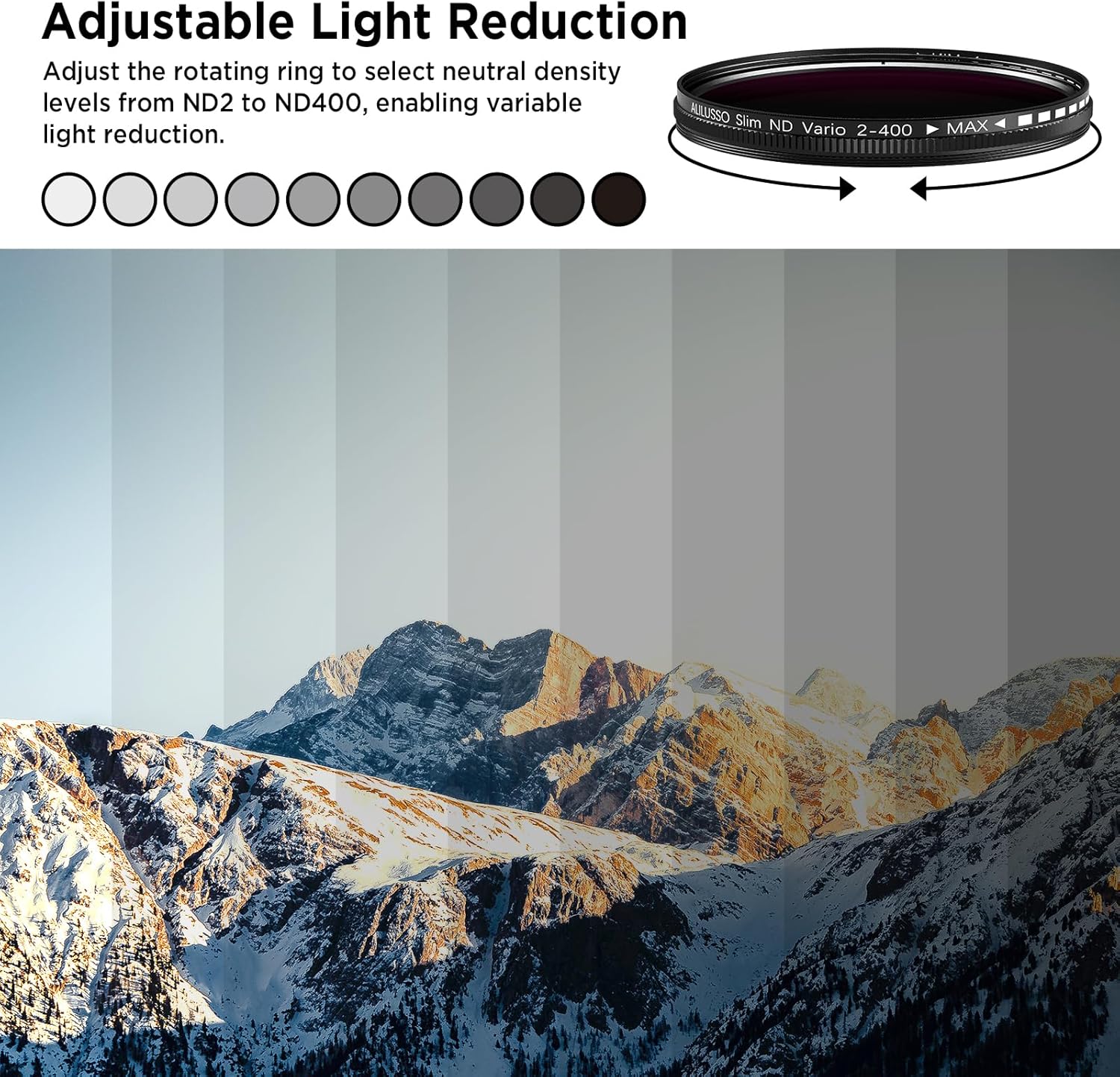 - Adjustable VND Filter--Our 52mm Variable ND filter has 1-11 stops to meet various shooting needs under different lighting conditions. ND filter can reduce the amount of light entering the lens, thereby decreasing the overall brightness of the image. They are ideal for capturing rivers, waterfalls, sunrises and sunsets, light trails, and other dynamic moving objects with motion blur. (Note: The black "X" crossing appearing in photos is an optical phenomenon that occurs when using excessively dense ND filter under specific lighting conditions. When shooting, try to avoid rotating the filter to the most dense position to reduce the occurrence of cross-light effects.)