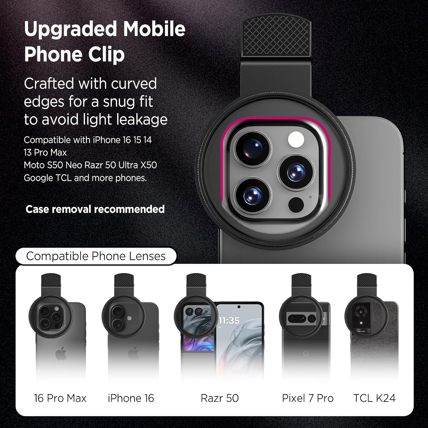 - Upgraded Phone Clip - Shoot Like a Pro DSLR Photographer- Crafted with curved edges for a snug fit to prevent light leakage, The clip is securely attached to your phone. Rubber padding covers all contact points to ensure scratch-free protection. Case removal recommended for optimal performance.