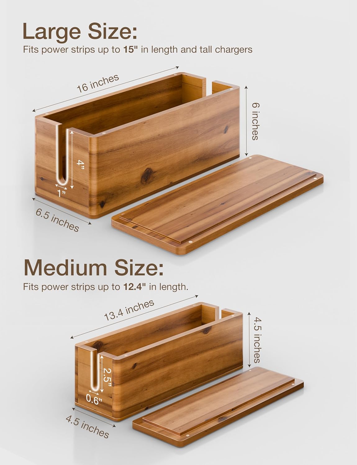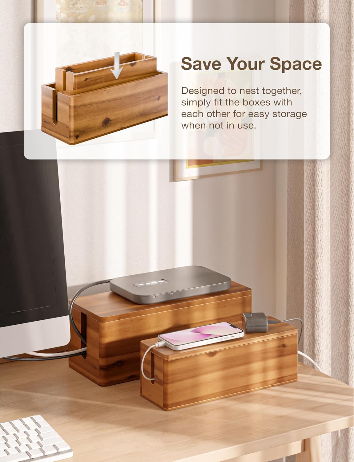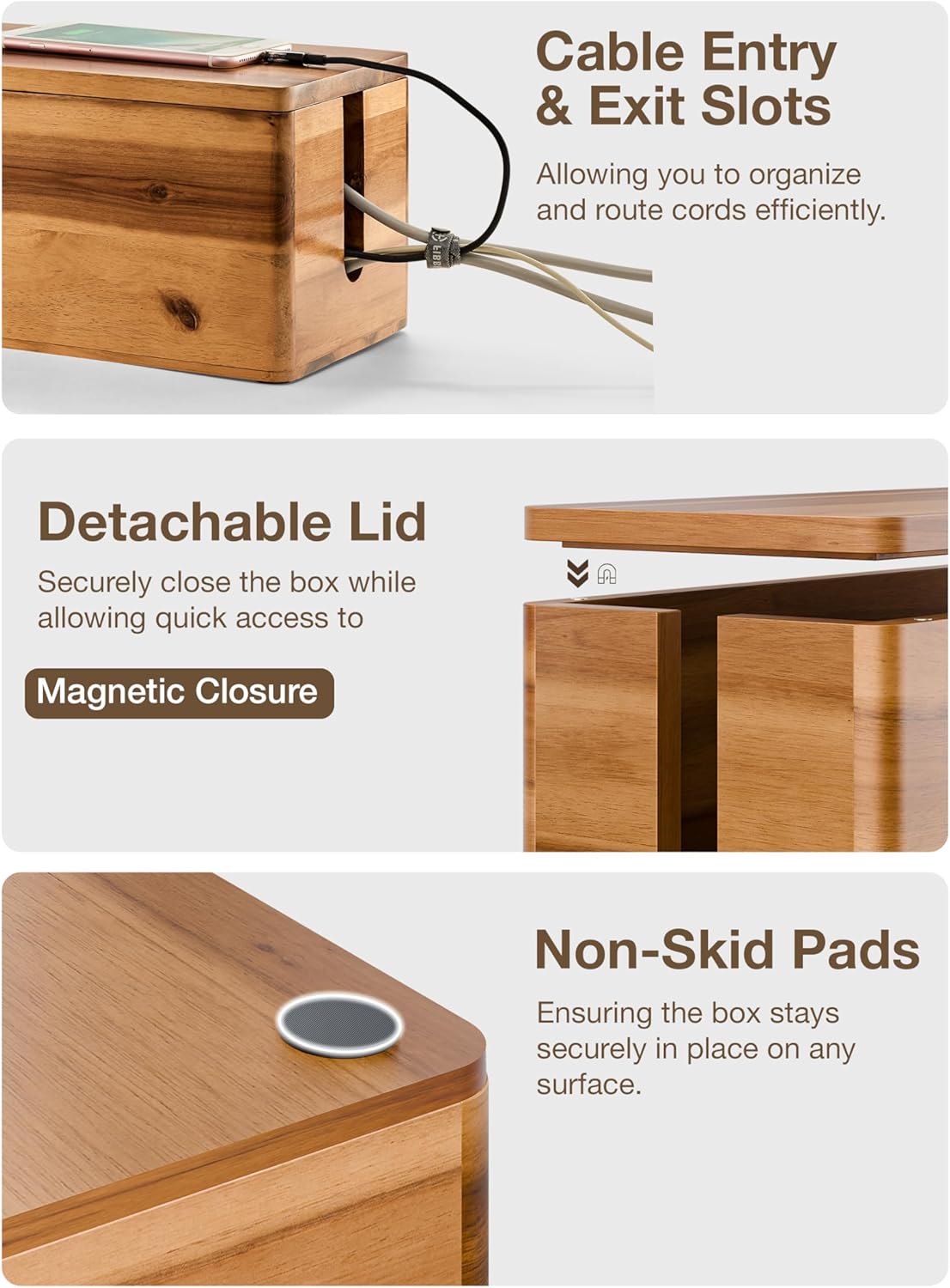 - Natural Acacia Wood: Handcrafted from solid acacia, each wooden cable management box features unique wood patterns, offering a premium alternative to plastic cable organizer boxes. A timeless upgrade that complements both modern and rustic interiors