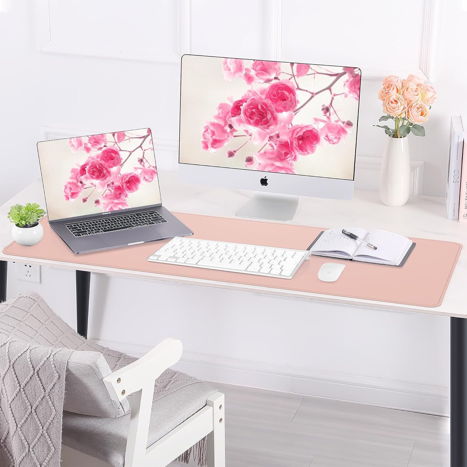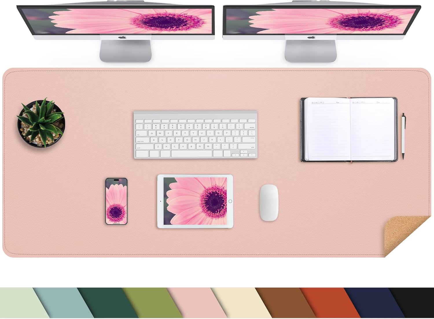 AFIING Leather Desk pad Protector, Large Non-Slip Office Desk Mat with Natural Cork & PU Leather, Waterproof Writing Mouse Pad for Office and Home (55in*17in,Pink)