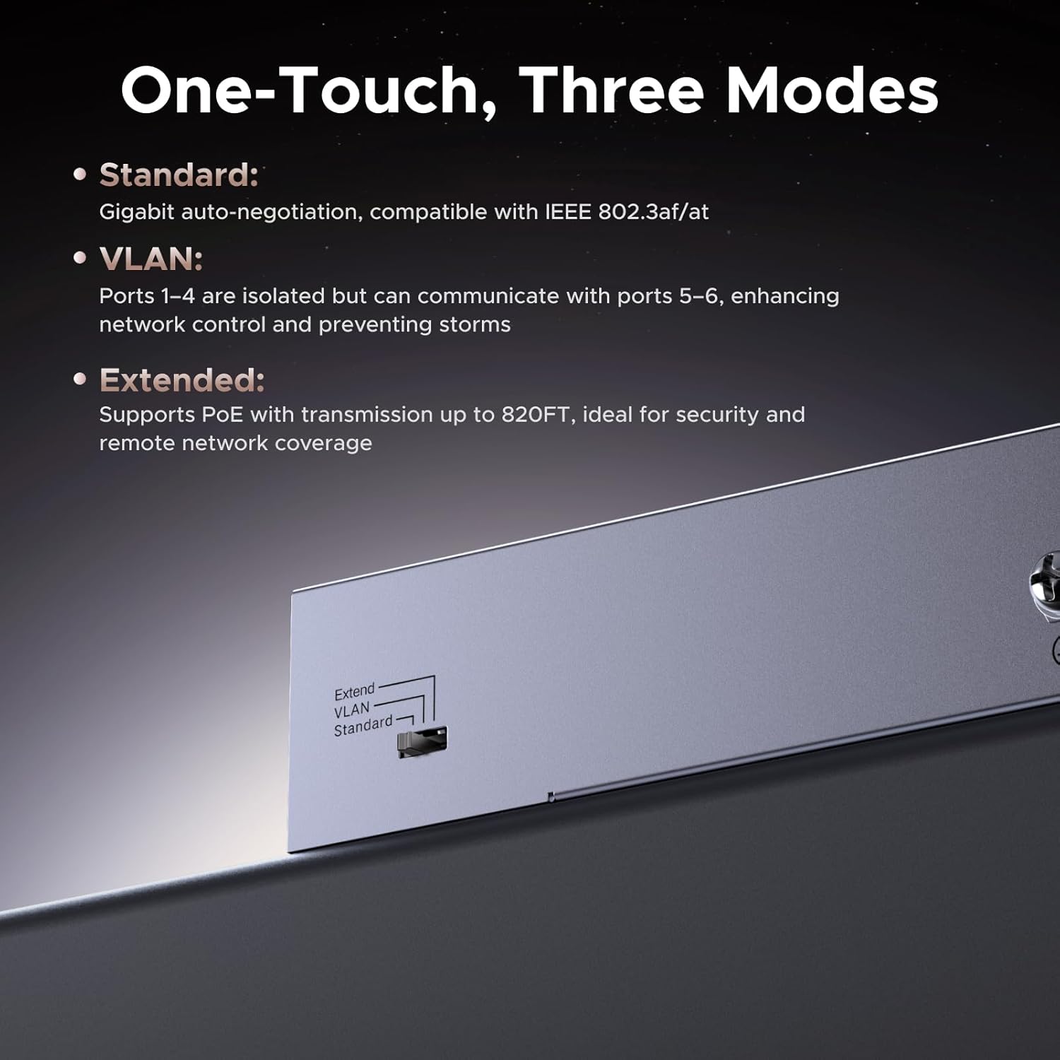 - One Touch, Three Modes: The ethernet hub can easily switch between Standard, VLAN, and Extend modes. VLAN isolates ports 1-4 for better management and storm prevention. Extend mode supports PoE up to 820FT, ideal for security and remote network coverage