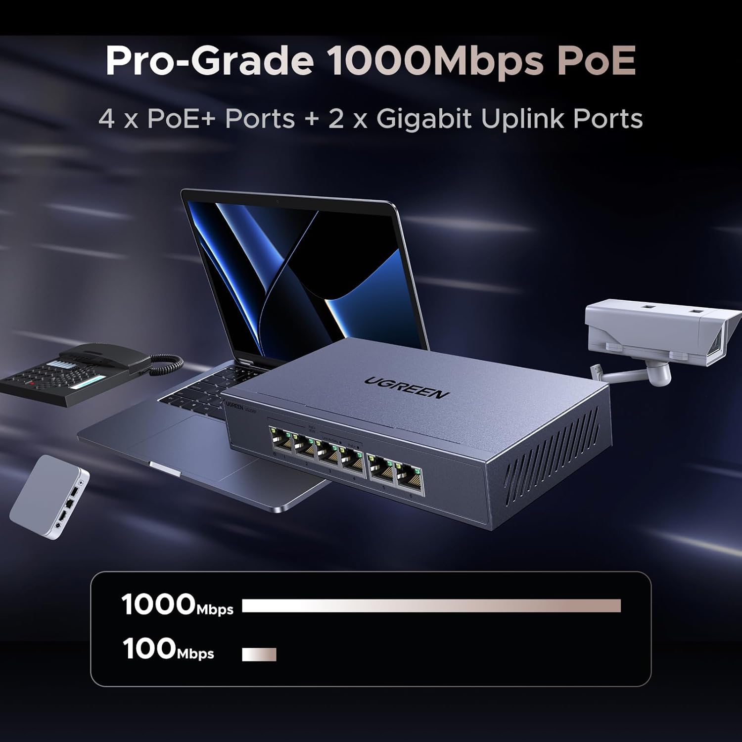 - More Ports, PoE Ready: UGREEN ethernet switch offers 4 PoE+ (802.3at/af) Gigabit ports (up to 30W each) and 2 Gigabit uplink ports, with a total power budget of 60W. Ideal for efficient power delivery and seamless network connectivity