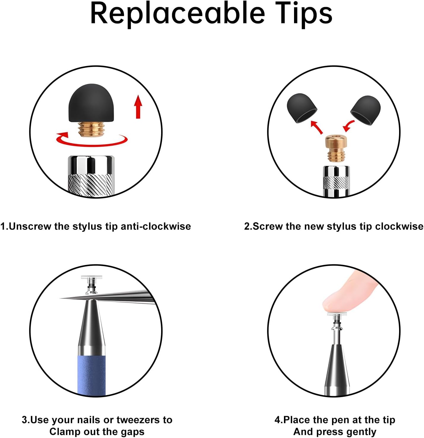 - 【What You Get】You get 5 different colored stylus pens and a portable replacement set of 6 rubber nibs and 3 clear nibs in one package.