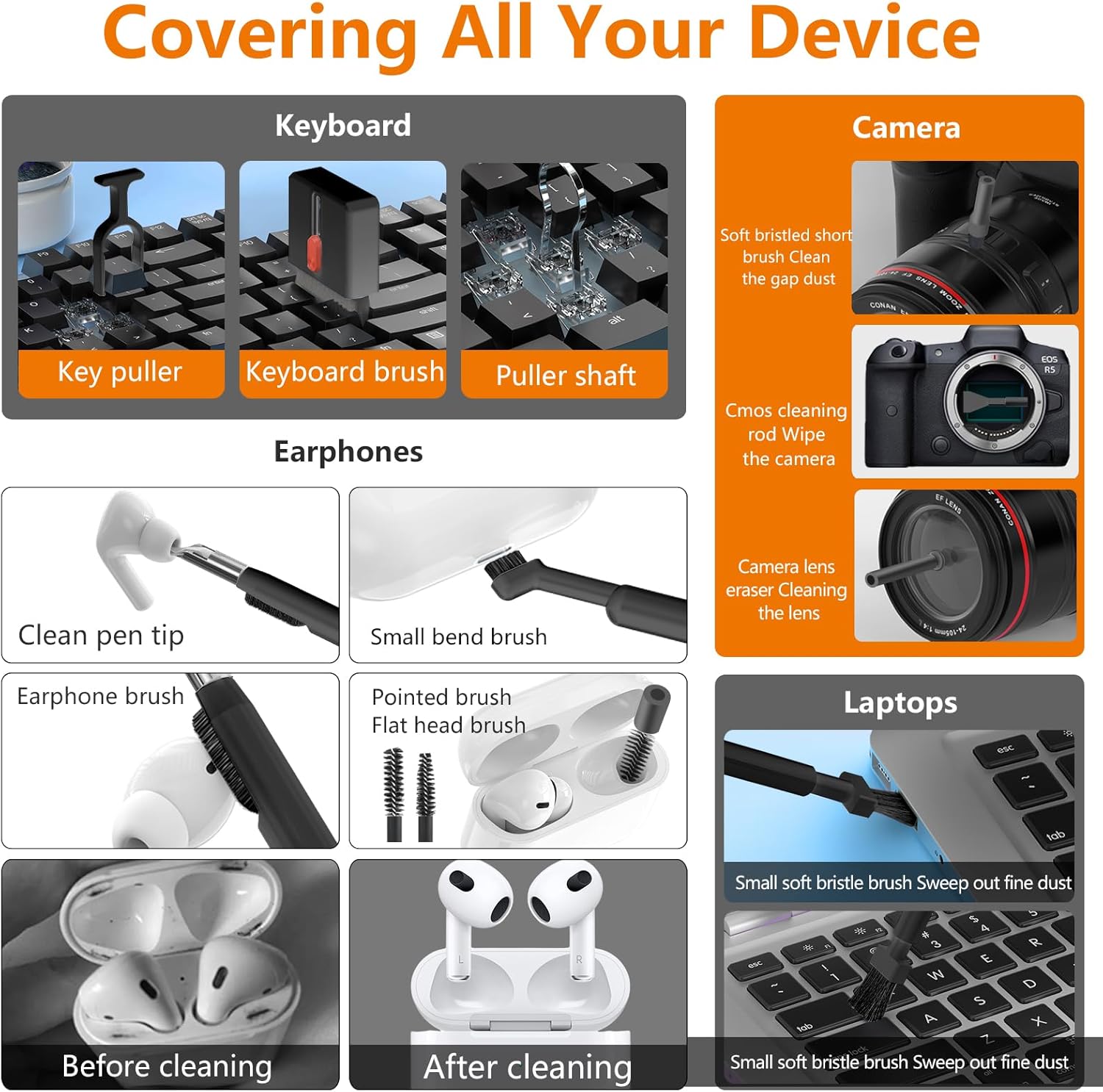 - AirPods & Earbuds Cleaning Kit: Your go-to airpods cleaning kit for maintaining peak audio quality—includes precision brushes and a cleaning pen to deep-clean earbuds and speaker grills, keeping your audio devices fresh and hygienic