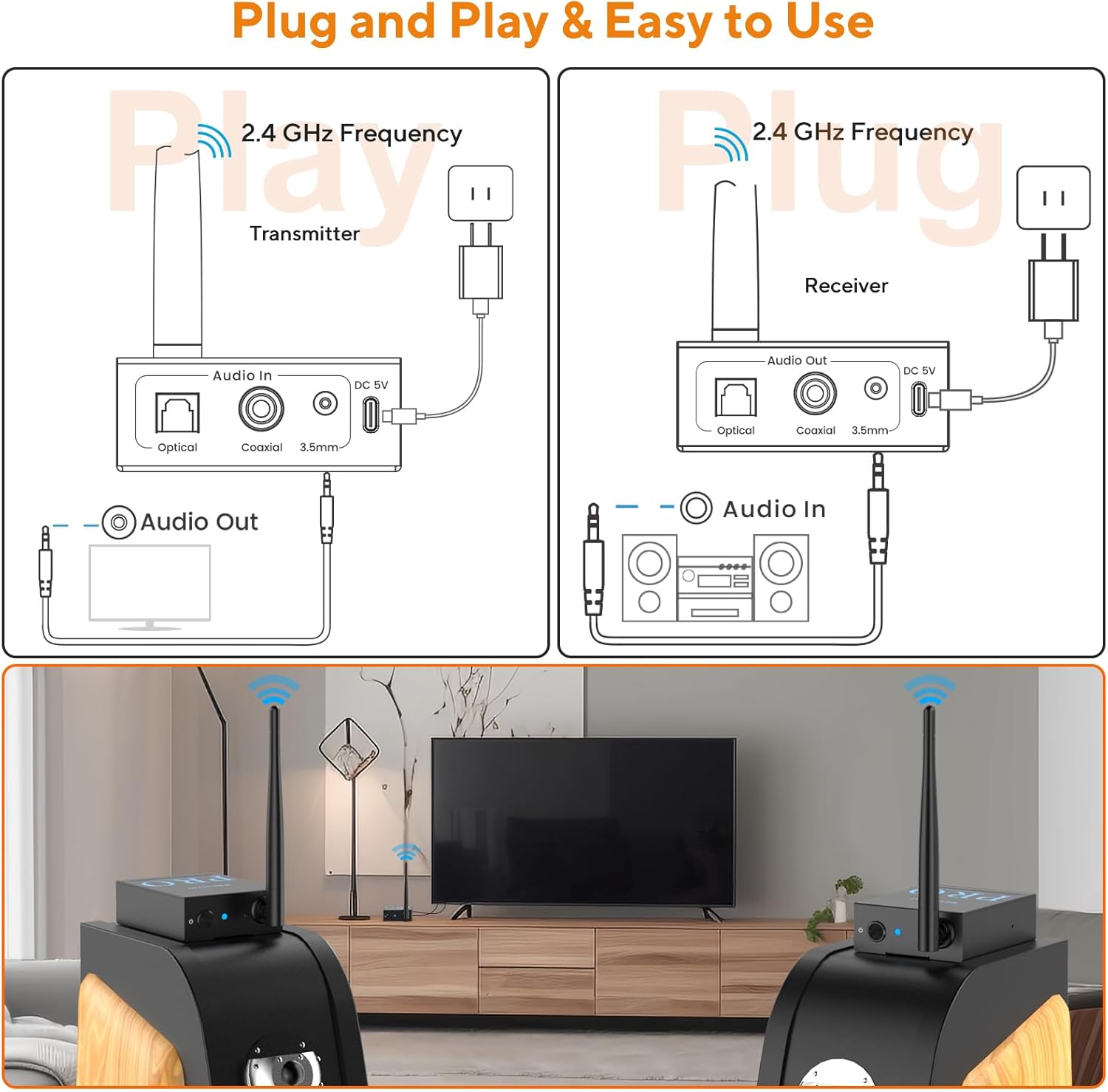 - 【No Cable Worries】If you want to listen to music on the wall speaker or backyard speaker but don't want so many cables, a wireless audio transmitter and receiver give you the best solution to connect your TV/PC/Projector and speaker wirelessly. DO NOT SUPPORT HDMI.