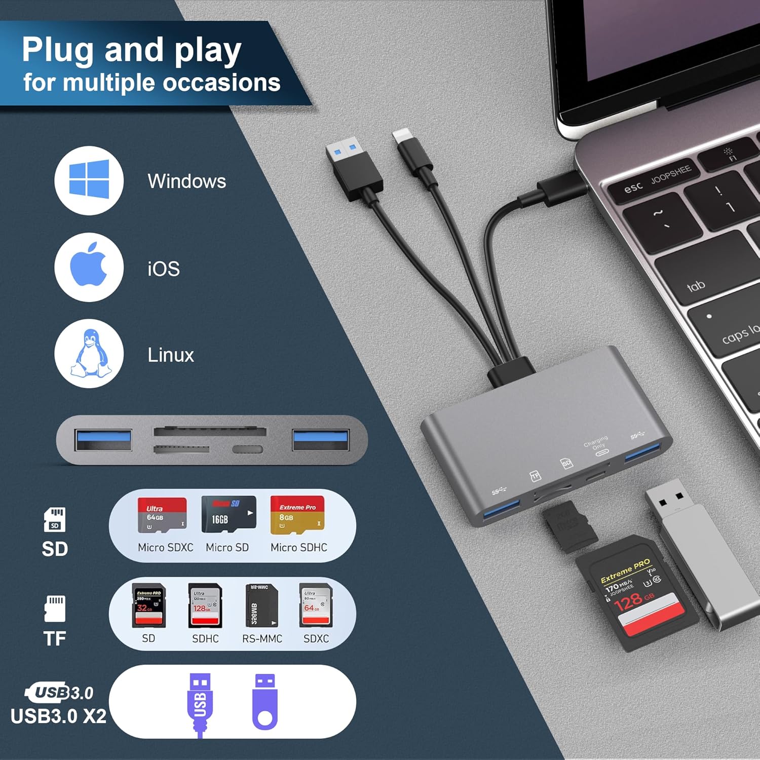 - Plug and Play: JOOPSHEE memory card reader has various interfaces, no WIFI, network or drivers required, super easy to use. usb / usb c(type c) /OS Connector/ sd card slot / micro sd card slot and Phone charging port for Phone/Pad, easily transfer photo video and file information.
