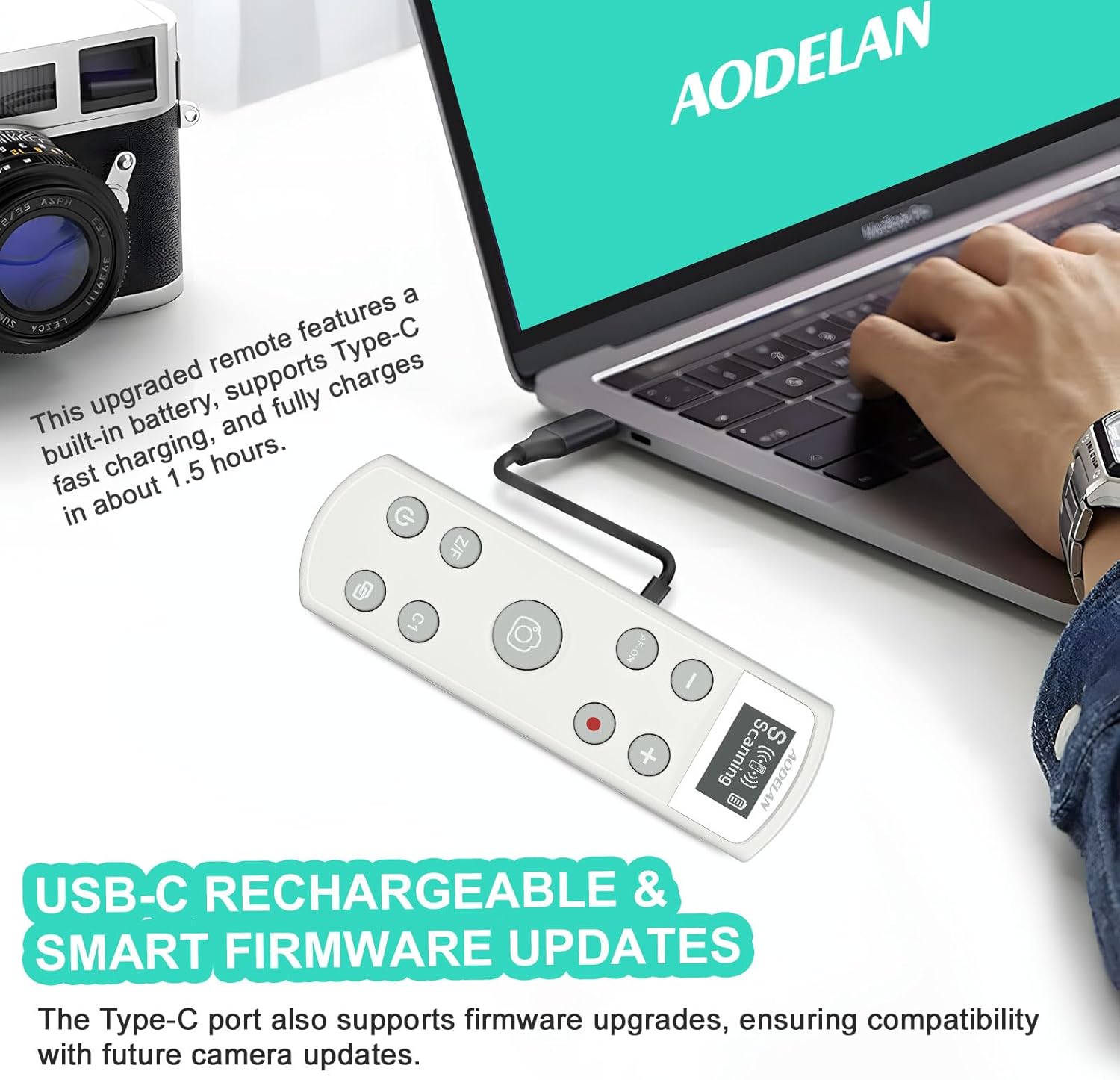 - Type-C Fast Charging & Smart Upgrades - This Wireless Camera Remote features a built-in battery with Type-C fast charging, fully recharging in about 1.5 hours (actual time may vary). It can be powered anytime via a power bank, laptop, or other Type-C sources, ensuring uninterrupted use without worrying about battery depletion affecting work or travel. Additionally, the Type-C port supports firmware upgrades, ensuring compatibility with the latest camera systems for an enhanced user experience.