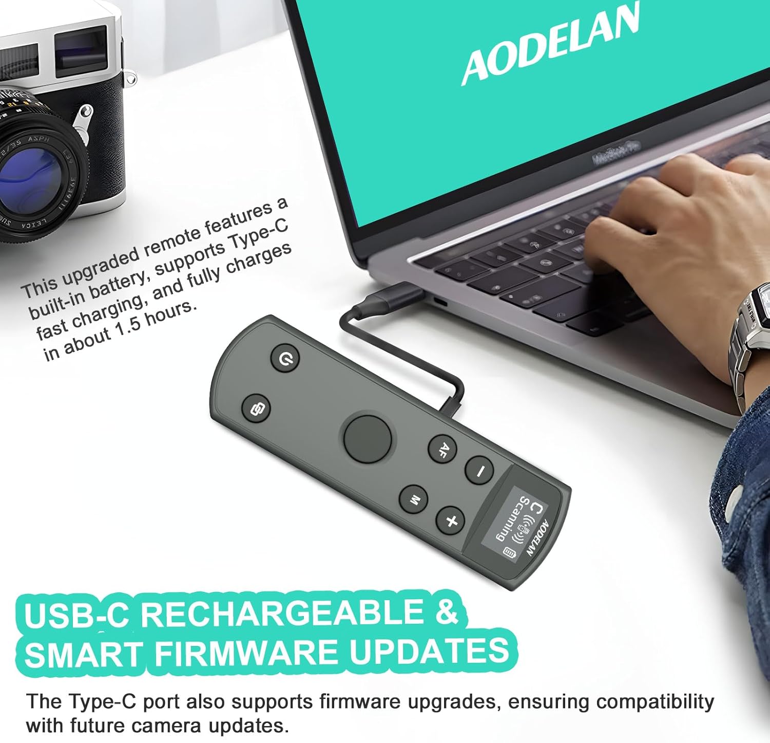 - Type-C Fast Charging & Smart Upgrades - This Wireless Camera Remote features a built-in battery with Type-C fast charging, fully recharging in about 1.5 hours (actual time may vary). It can be powered anytime via a power bank, laptop, or other Type-C sources, ensuring uninterrupted use without worrying about battery depletion affecting work or travel. Additionally, the Type-C port supports firmware upgrades, ensuring compatibility with the latest camera systems for an enhanced user experience.