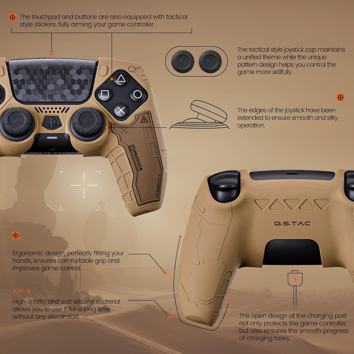- Tactical Aesthetics: The G.S.TAC PS5 controller cover is a visual marvel. Its sleek, matte desert yellow finish exudes a sense of power and sophistication, perfectly complemented by its robust, angular design. The controller's aesthetic is inspired by military-grade equipment, evident in its rugged contours and tactical accents