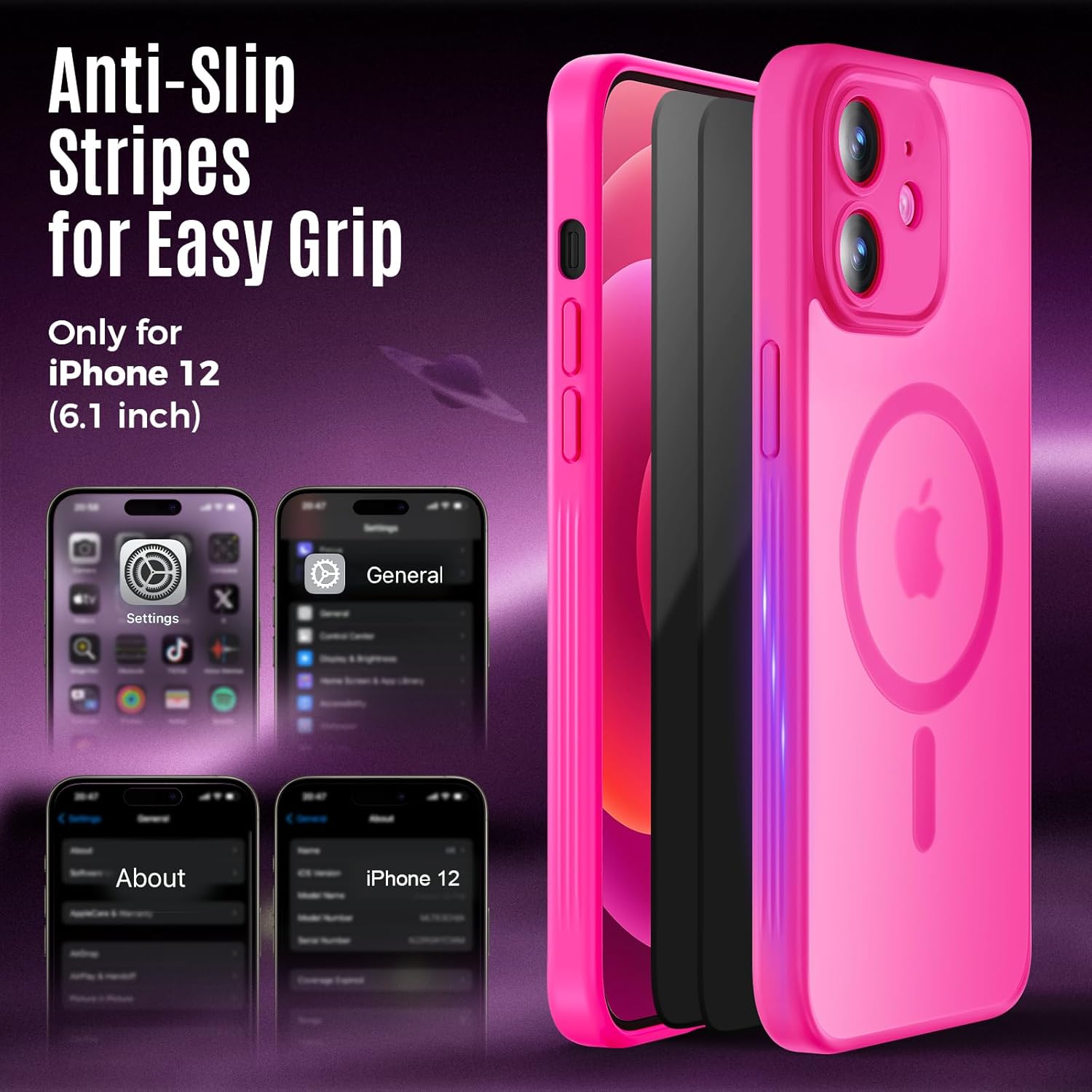Designed for iPhone 12 Case, Compatible with MagSafe, with Privacy Screen Protectors X2, [Camera Protection] [15FT Military Drop Protection] Shockproof Phone Case, 6.1", Hot Pink