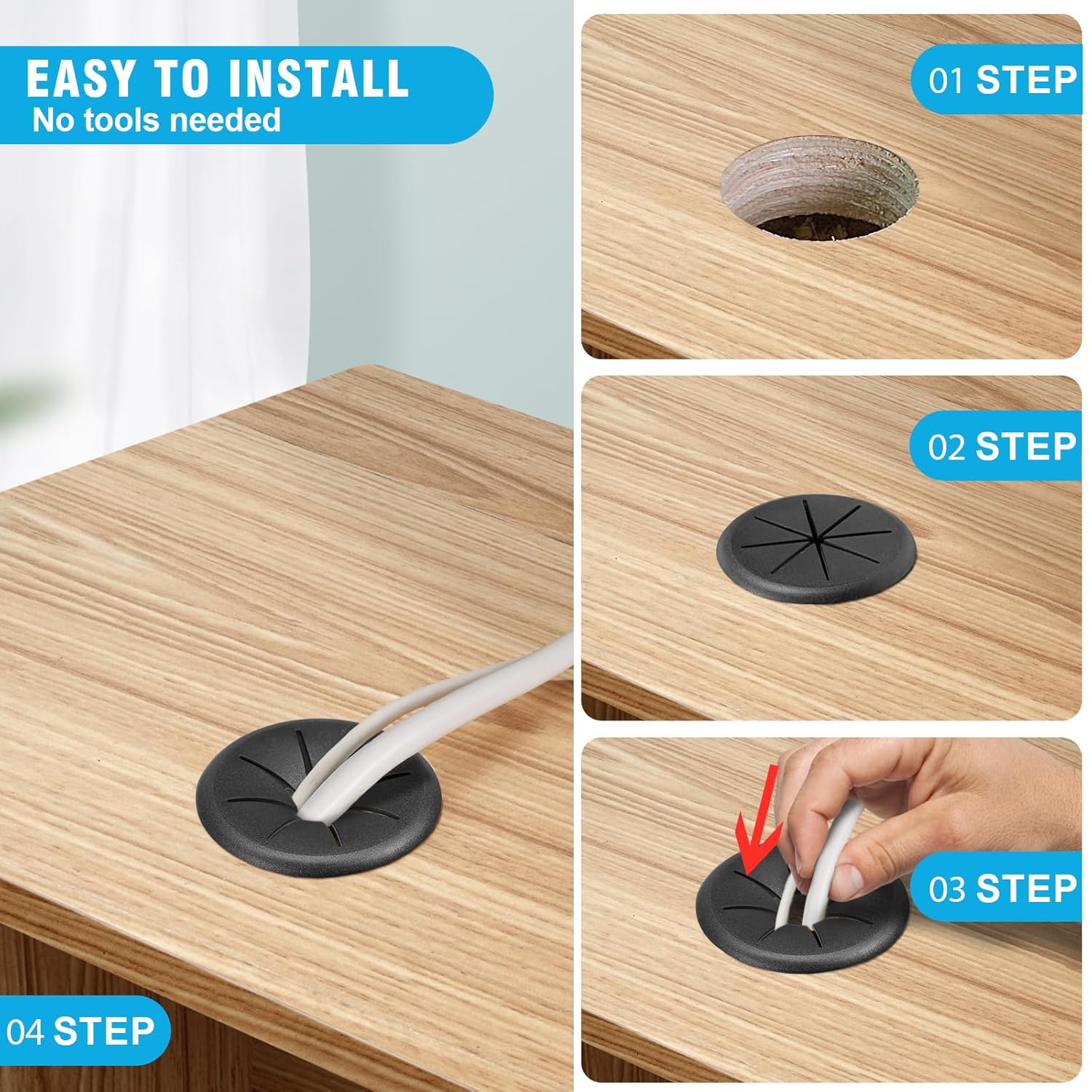 - DELIGHTS PACKAGE -- Your package includes 10 x 2-3/8" desk grommets. Useful Tips: ① Make sure the hole's edges are smooth and free of splinters that could damage your cables or the grommet, ② Place the grommet into the hole. It should fit snugly, ③Finally, route your cables through the desk grommet.
