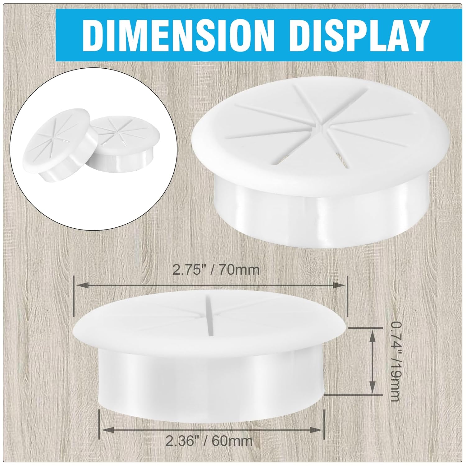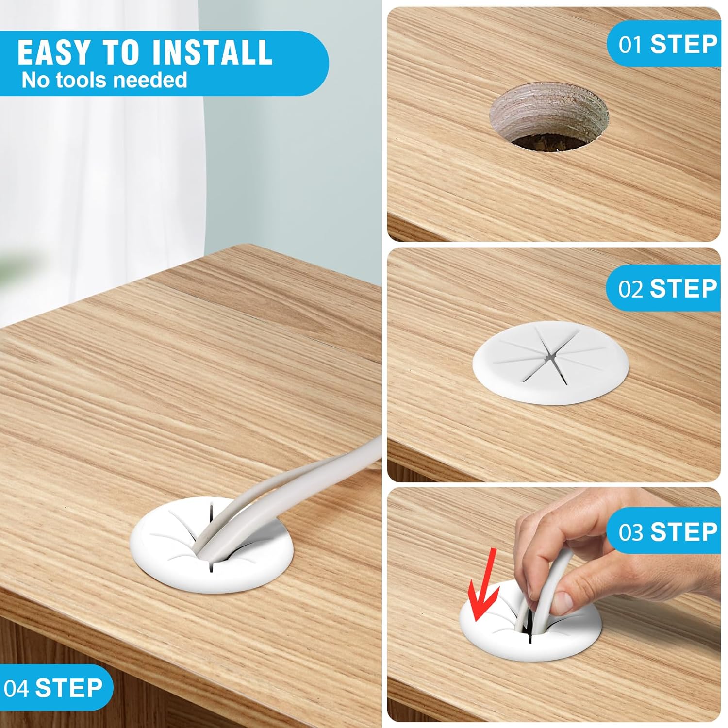 - DELIGHTS PACKAGE -- Your package includes 2 x 2-3/8" desk grommets. Useful Tips: ① Make sure the hole's edges are smooth and free of splinters that could damage your cables or the grommet, ② Place the grommet into the hole. It should fit snugly, ③Finally, route your cables through the desk grommet.