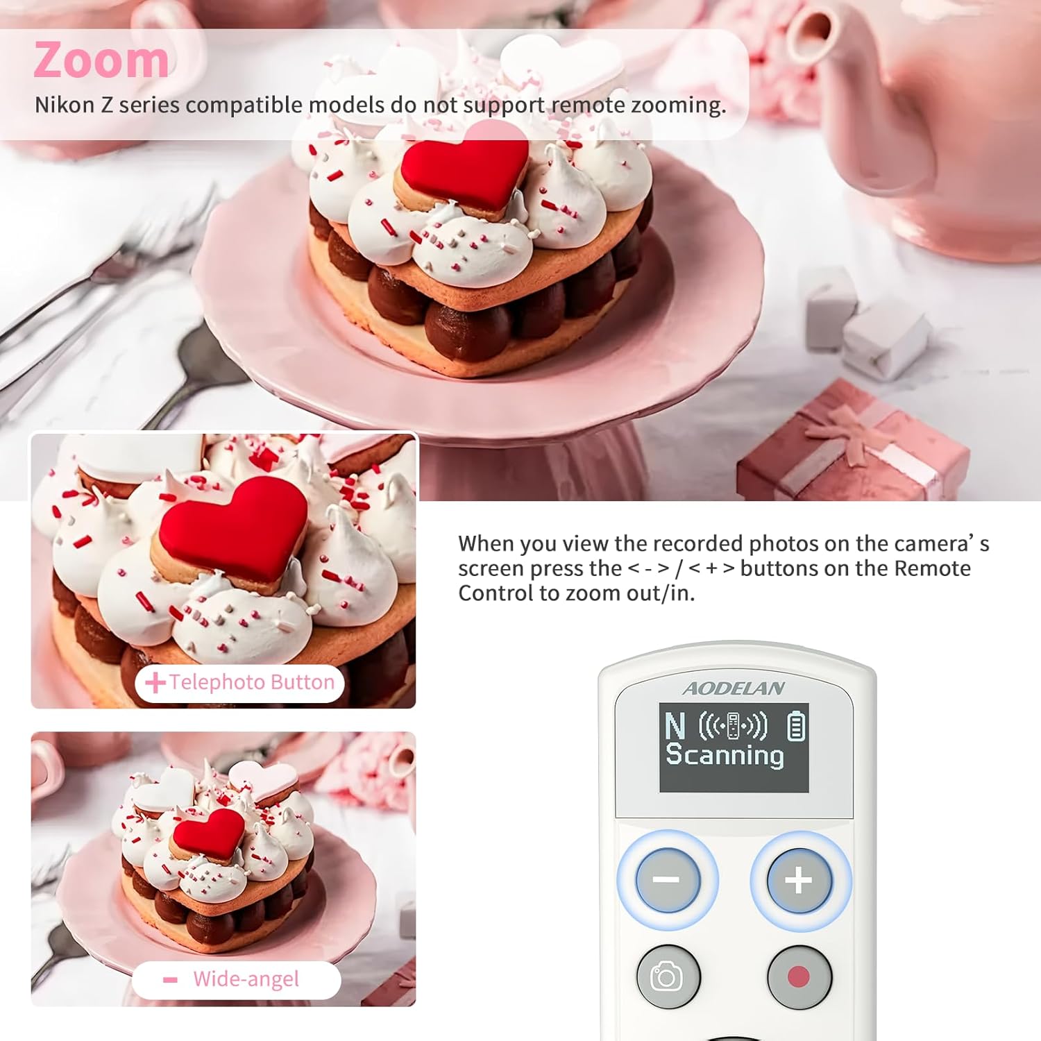 - Camera Zoom: Press the < - > button to zoom to the wide-angle side or the < + > button to zoom to the telephoto side.Nikon Z series compatible models do not support remote zooming. When you view the recorded photos on the camera's screen, press the < - > / < + > buttons on the Remote Control to zoom out/in.