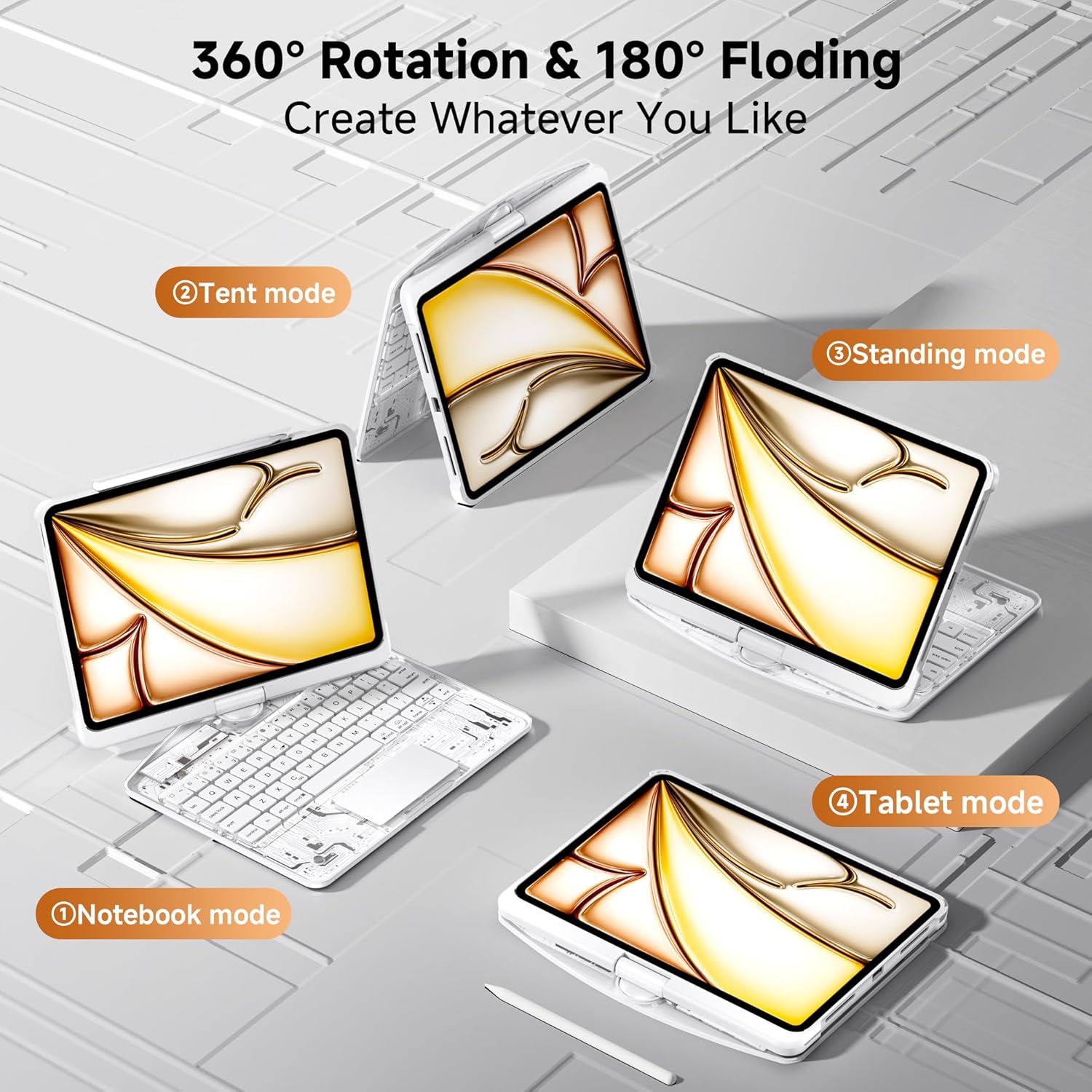 iPad Keyboard Case for 2024 M4 iPad Pro 11 inch, Magic Wireless Keyboard with Trackpad 7 Color Backlit, 360° Rotating Stand Transparent Protective Cover with Pencil Holder (White)