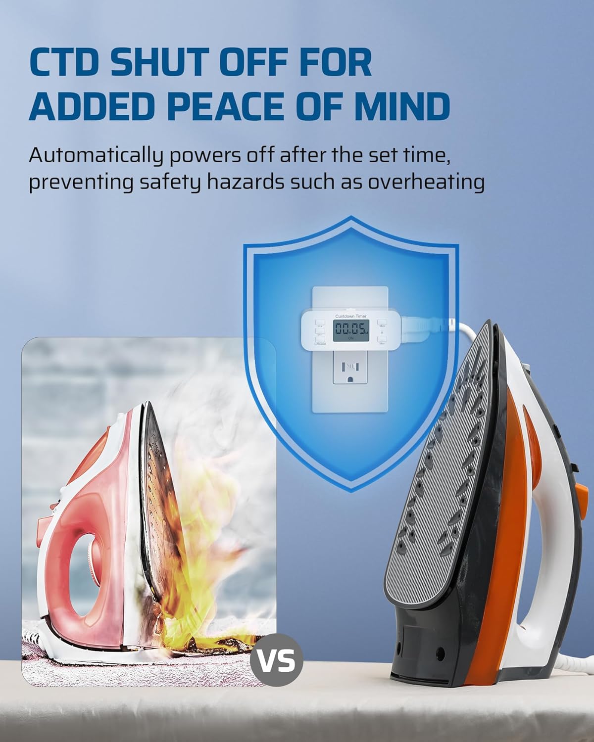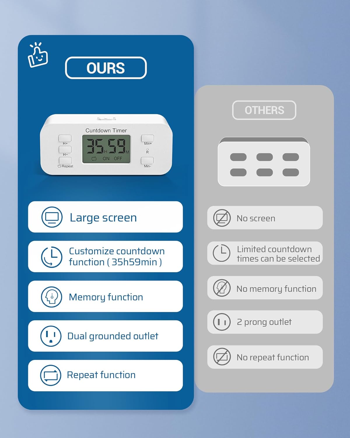 - [Custom Countdown Timer Outlet] Features Always ON/OFF/CTD modes with a side switch for easy selection; set a countdown timer up to 36 hours using simple H+/H-/Min+/Min- buttons—no complex programming required; flexible settings meet your various needs with just a few presses