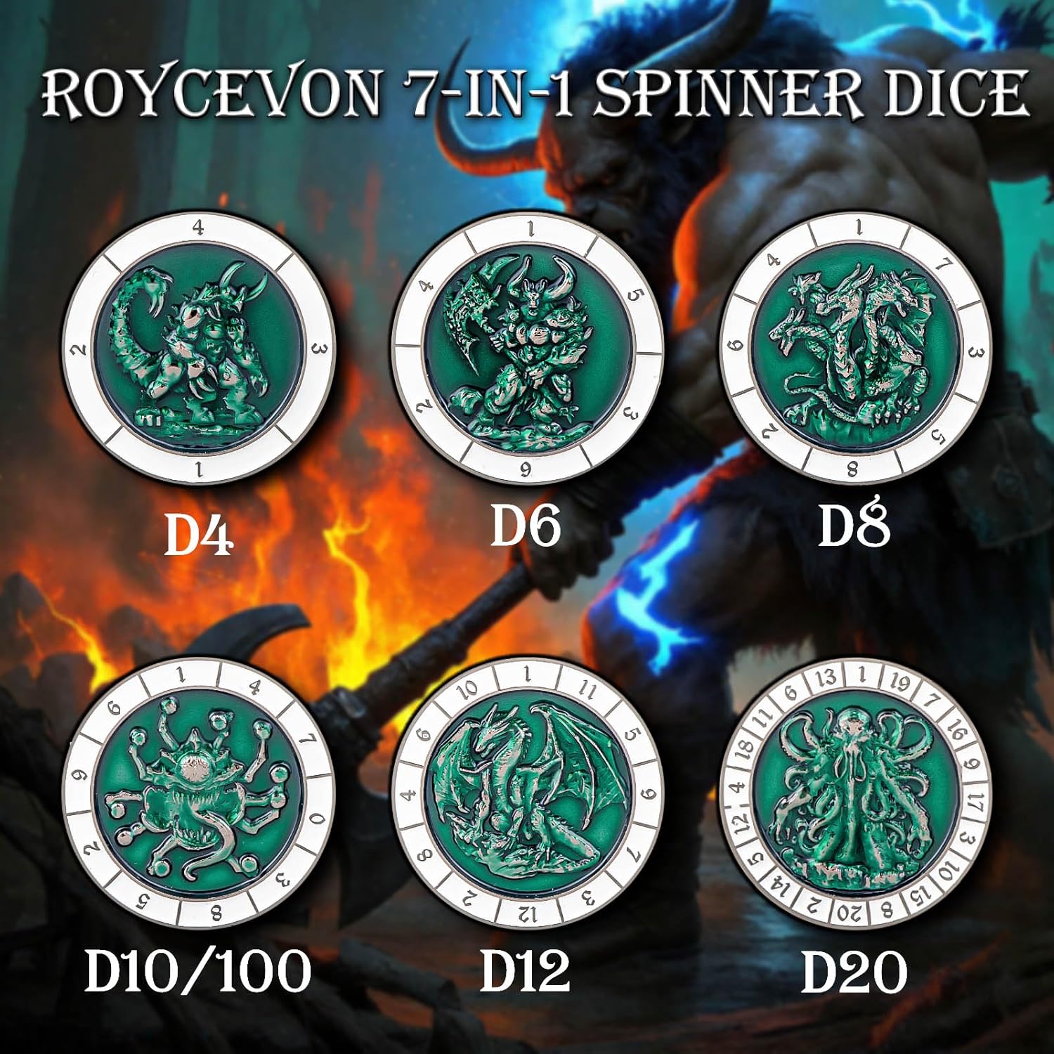 - 7-in-1 Spinner Dice : Metal DND Dice Set is a 7-in-1 rotating dice that combines d4, d6, d8, d10, D10%, d12, and d20. Just have a dice and enjoy 6 different designs, it will give you a different experience