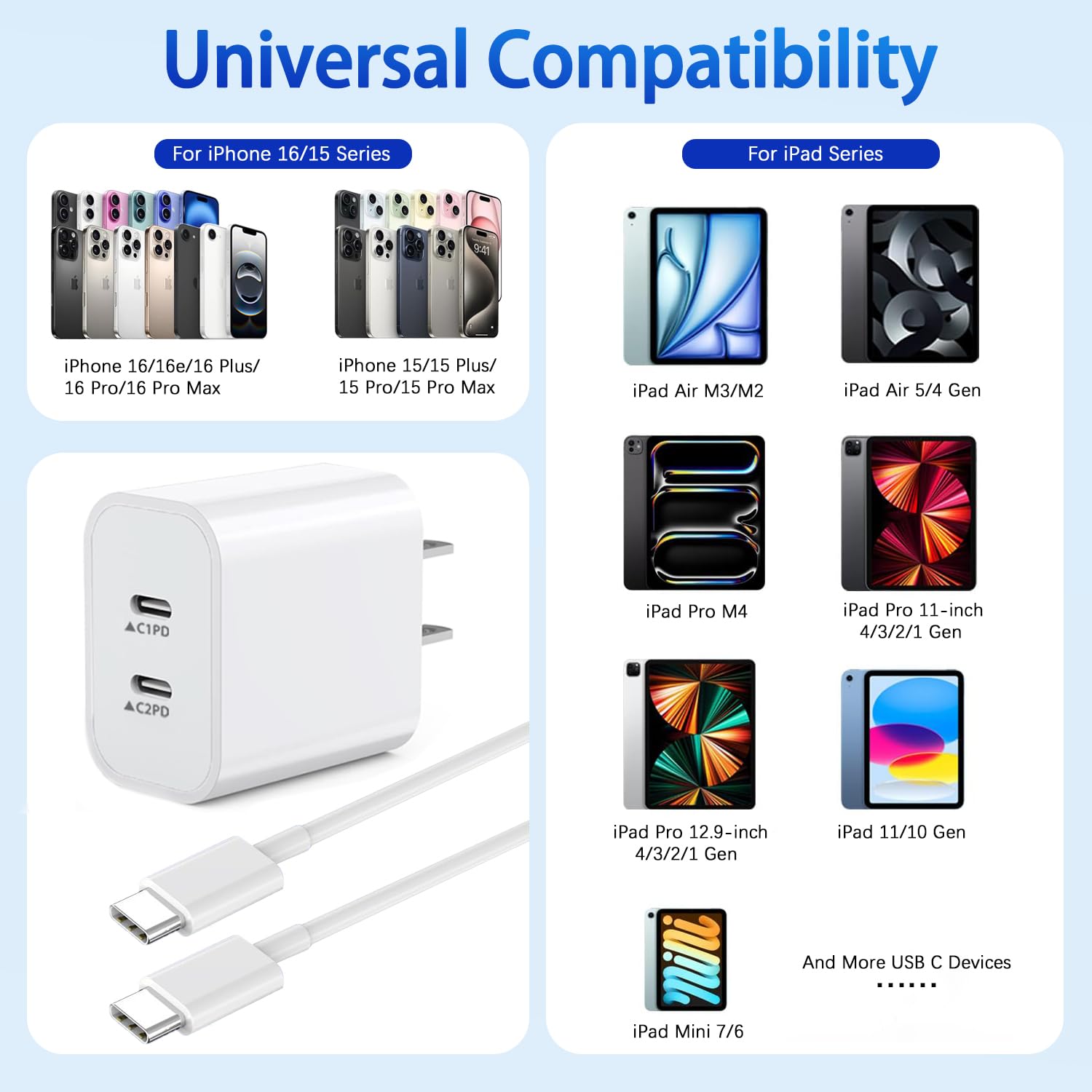 - [Charger Fast Charging for Apple IPhone 16/15]Charger fast charging block has two separate up to 20W output ports can charge two devices simultaneously. The Dual USB C Port for IPhone 16/15 Charger USB C Block with 10FT long USB C to USB C fast charging cable cord can charge for Apple IPhone 16/15 from 0-50% in 30 minutes, which saves you over an hour compared to the 5W charger.