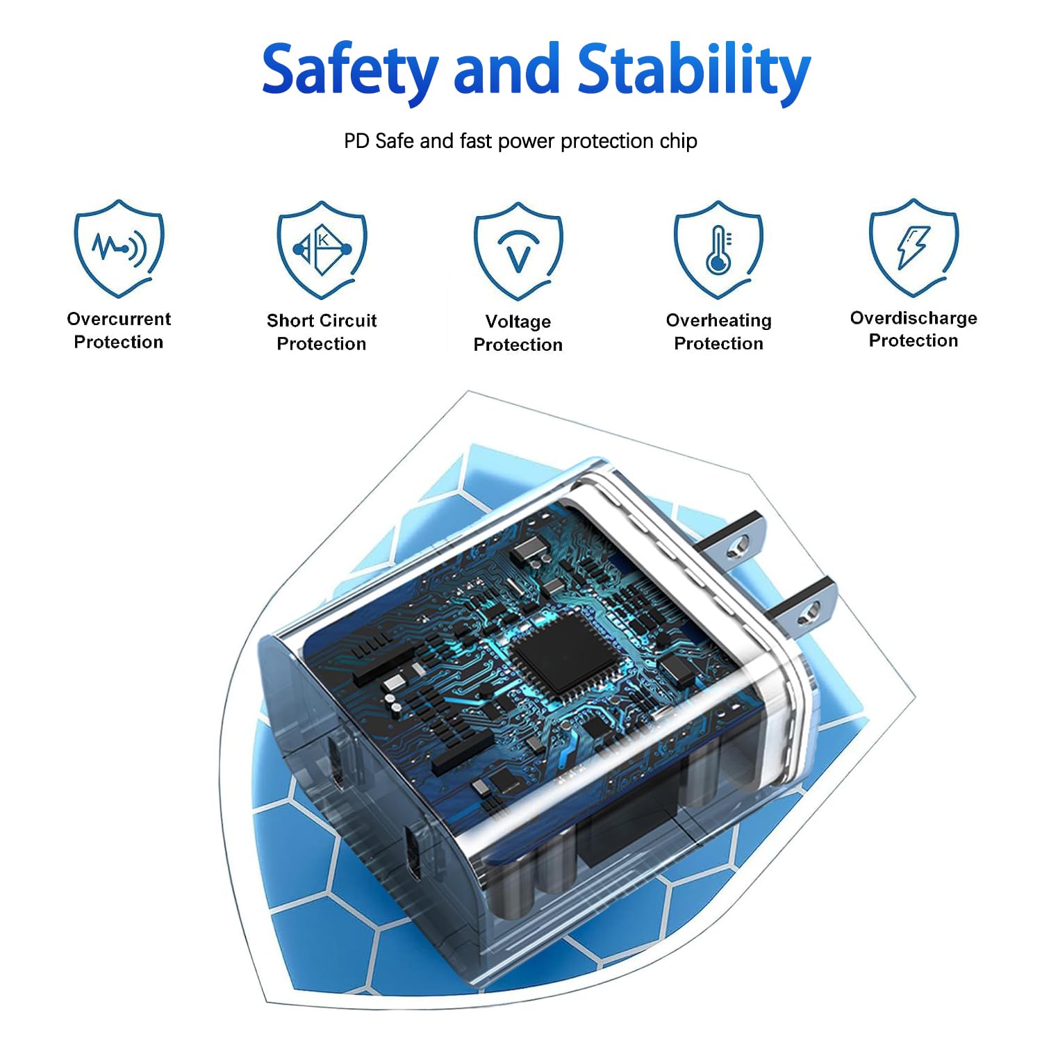 - [Comprehensive Protection]The 2in1 double type-c port Fast charger features multiple safety systems, including overcharge/high-voltage protection, current regulation, temperature control and many more features to ensure safe charging at all times.
