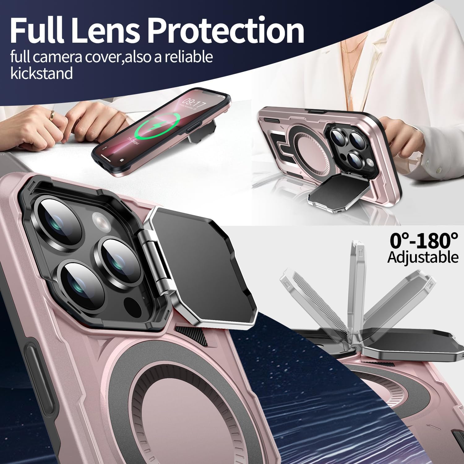 Camera Stand Case for iPhone 13 Pro, [Compatible with Mag Safe] [Lens Cover] 2024 Version Military Grade Protective Soft Case for iPhone 13 Pro 6.1 inch Men Women, Pink