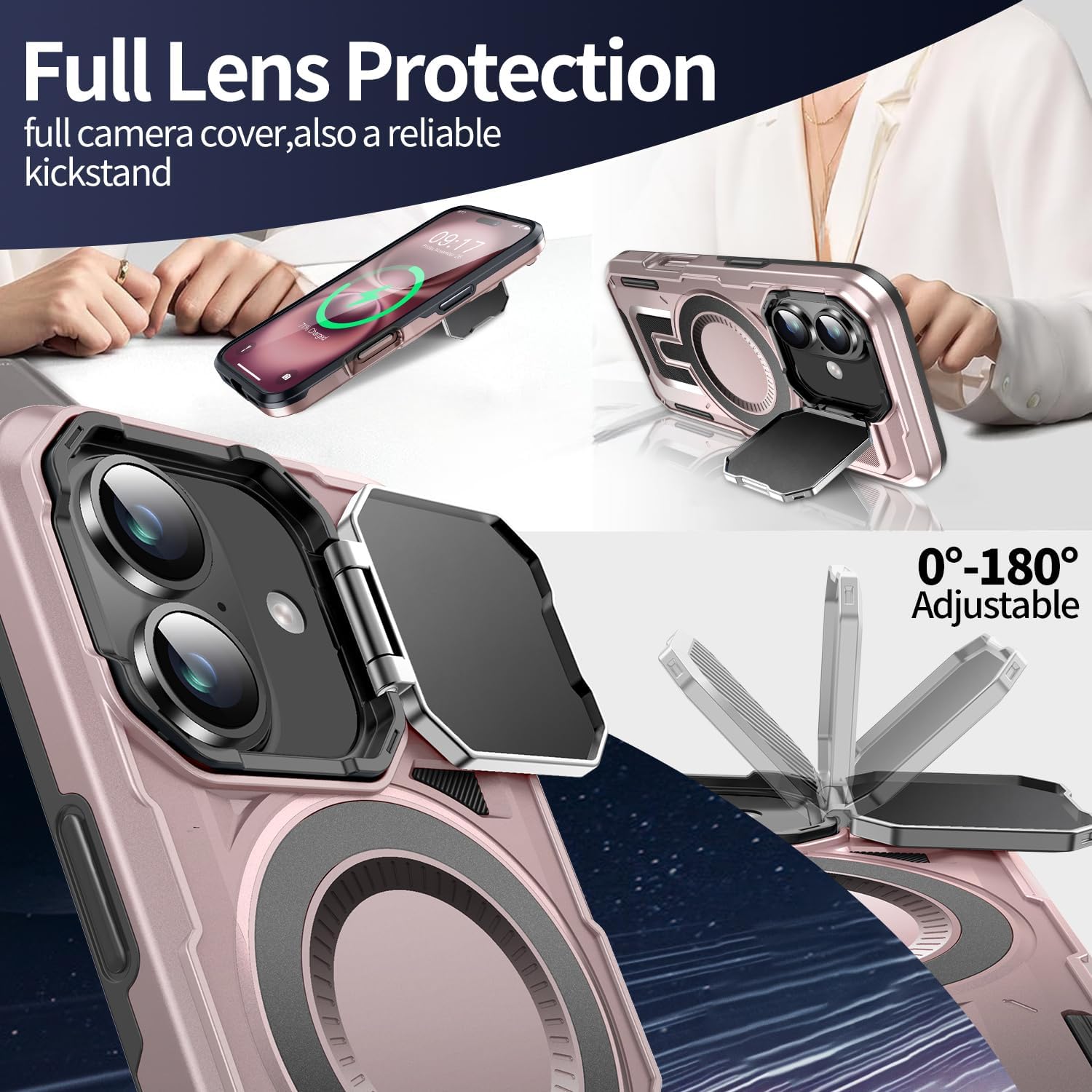 Camera Stand Case for iPhone 16, [Compatible with Mag Safe] [Lens Cover] 2024 Version Military Grade Protective Soft Case for iPhone 16 6.1 inch Men Women, Pink