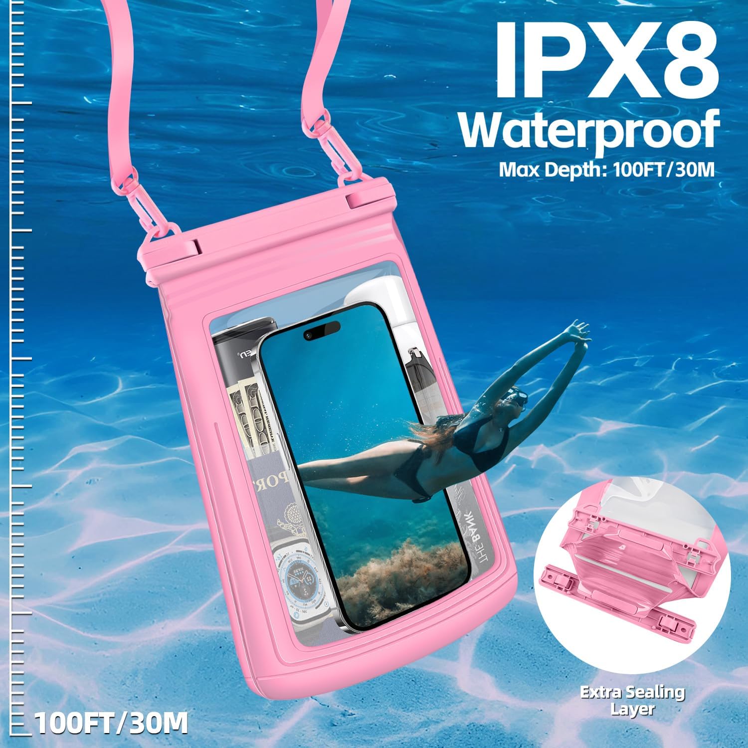 - [Double-Sealed IPX8 Waterproof Guarantee] Features ABS material sealing with double lock buckles and an extra sealing strip for reinforced, leak-proof protection. Rigorously tested 1,000 times at depths up to 30 meters (100 feet), safeguards phones and essentials even in high-pressure underwater conditions. Guaranteeing your valuables stay safe and dry every time.