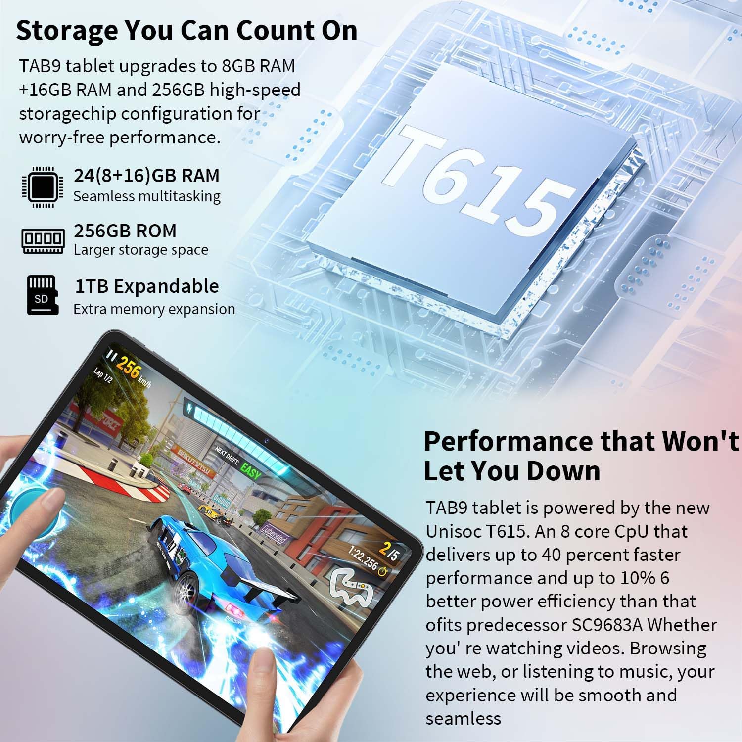 - 【24GB + 256GB + 1TB Expandable + 8-core CPU + GMS】QDDQ Android Tablet has up to 24GB RAM (8GB RAM + 16GB virtual RAM) and 256GB ROM storage, expandable up to 1TB via micro SD card (not included). How to check 8GB RAM: "Settings" → "System" → "Memory Expansion/Memory Expansion" → "Expanded Memory 8.0GB/Expanded Memory 8.0GB". The tablet runs the 1.6GHz Unisoc T615 8-core processor. This convergence ensures optimal performance for work and multimedia, providing a seamless, energy-efficient tablet experience. With the Mail G57 graphics processor, you can play popular mobile games smoothly. TAB9 Android Tablet is GMS certified!