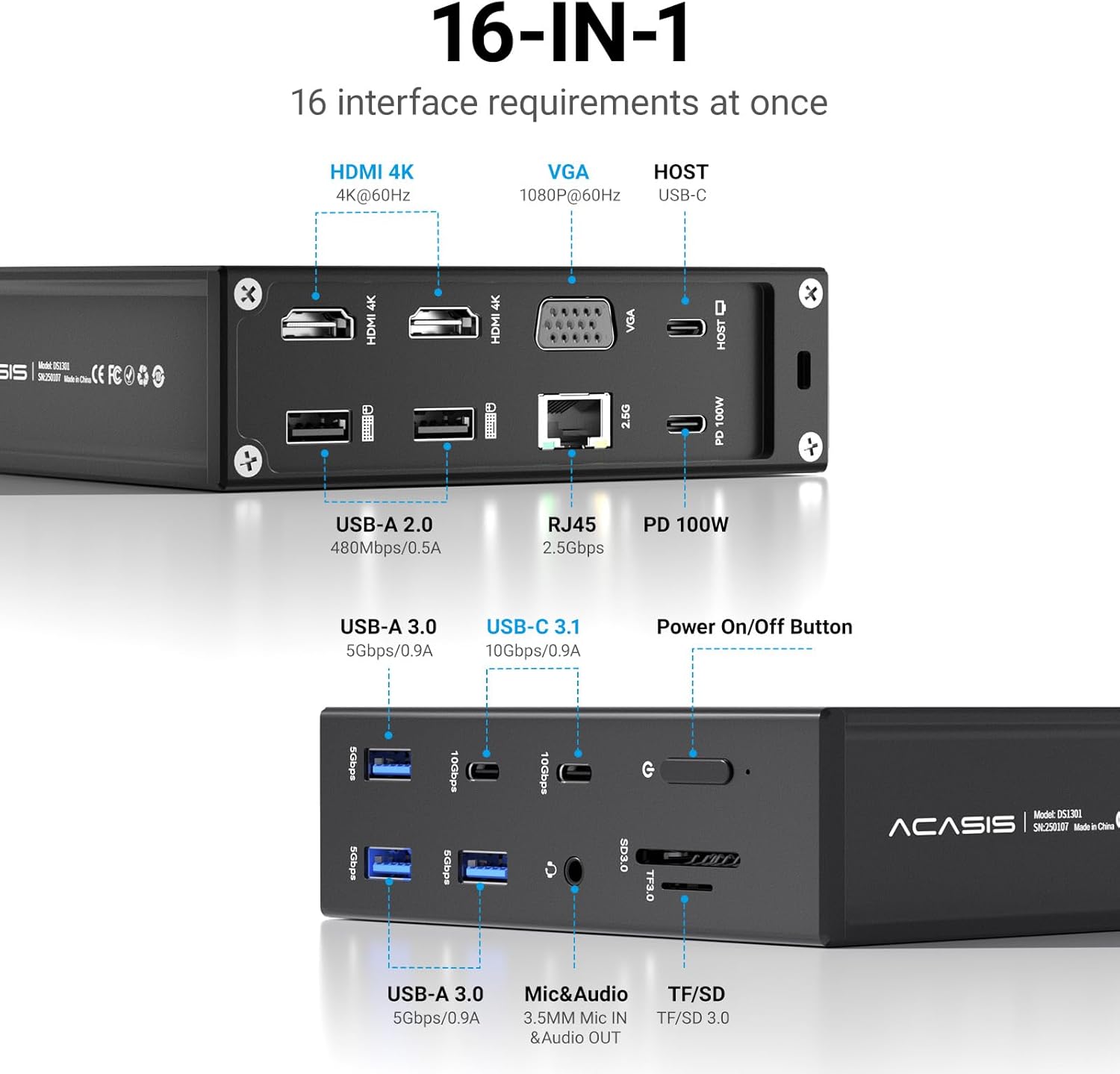 ACASIS USB C Docking Station Dual Monitor,16-in-1 Laptpop Docking Station with 2* HDMI,VGA,2.5G Ethernet,SD/TF,10Gbps USB-C 3.1,3.5mm Audio,PD100W,USBC Hub for MacBook/Dell/Lenovo/HP/ThinkPad (Black)