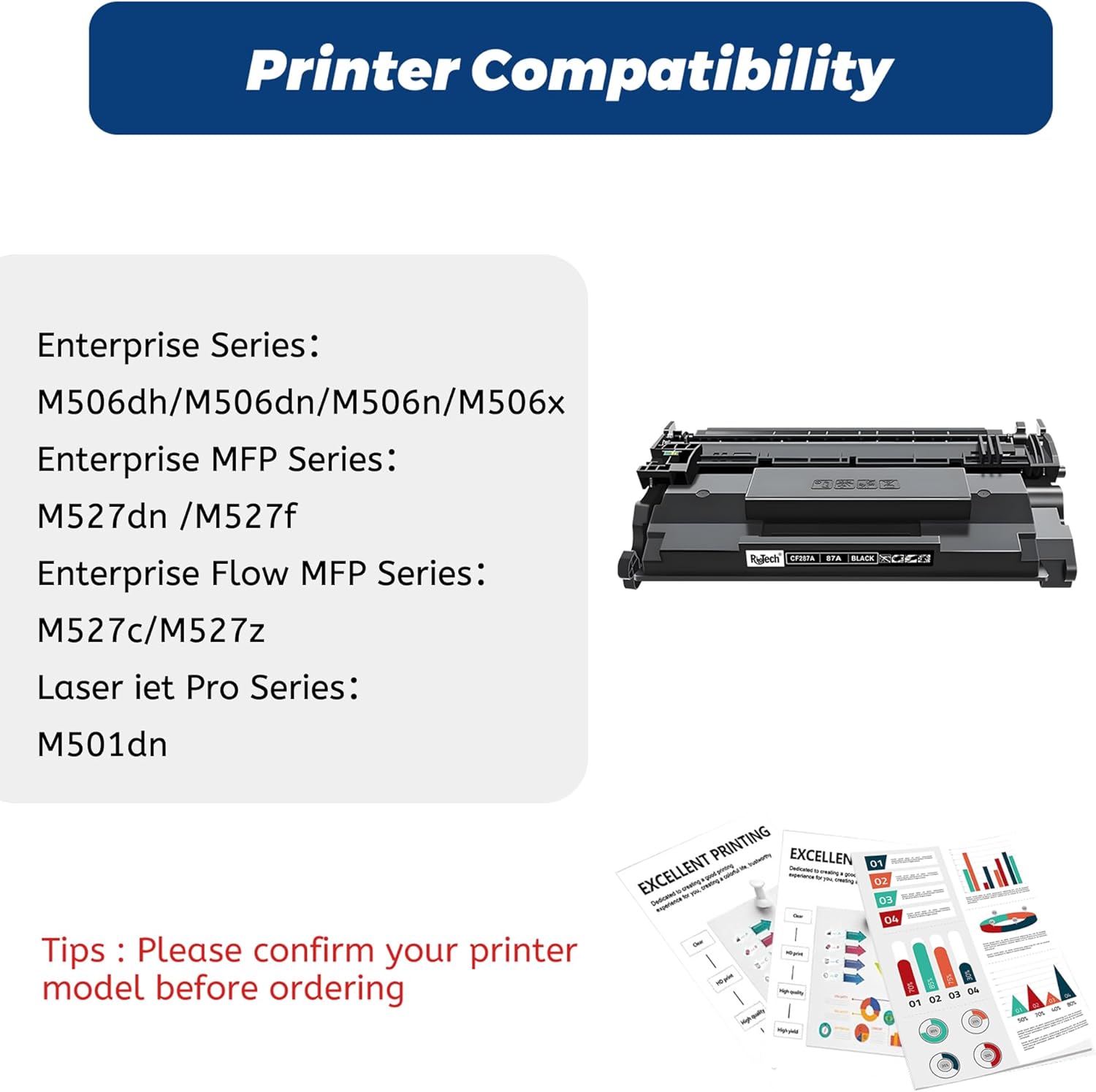 - 【Compatible Models】 87A Toner Cartridge Compatible for HP Laserjet Enterprise Flow MFP M527c, M527z; Enterprise M506dh, M506dn, M506n, M506x; Enterprise MFP M527dn, M527f; Pro M501dn printer