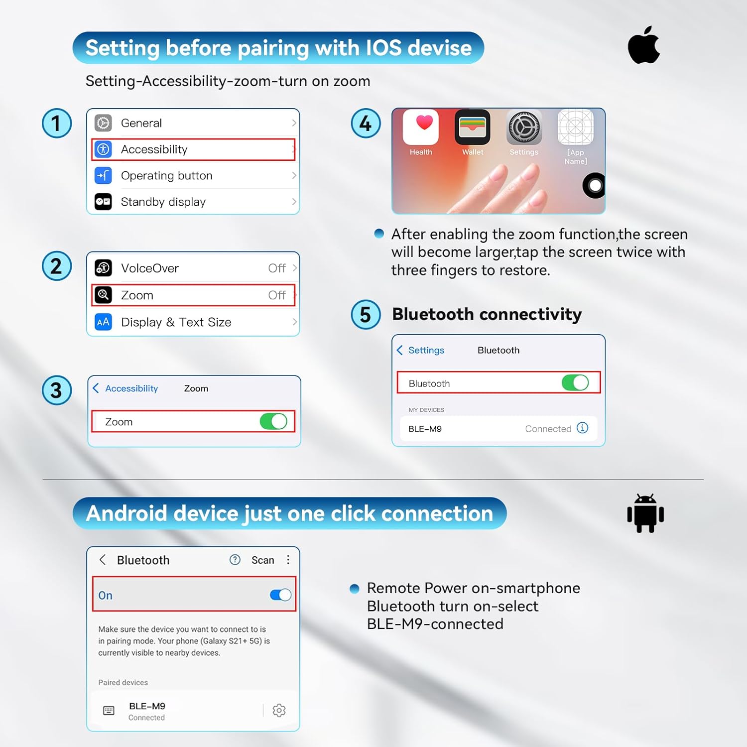 - 【Wireless Remote Control for short video】you can use the Bluetooth Scrolling Remote Control to Swipe the next/previous video, give a like, Volume +/-, left and right Swipe. Hands-free Operation with this Bluetooth remote control. iOS devices Settings: Open setting>Accessibility>Zoom>Turn on Zoom>Using three finger twice click the screen to restore, then you can connect the remote via Bluetooth. Note:Only for Tiktok, not work well with other short video APPS.