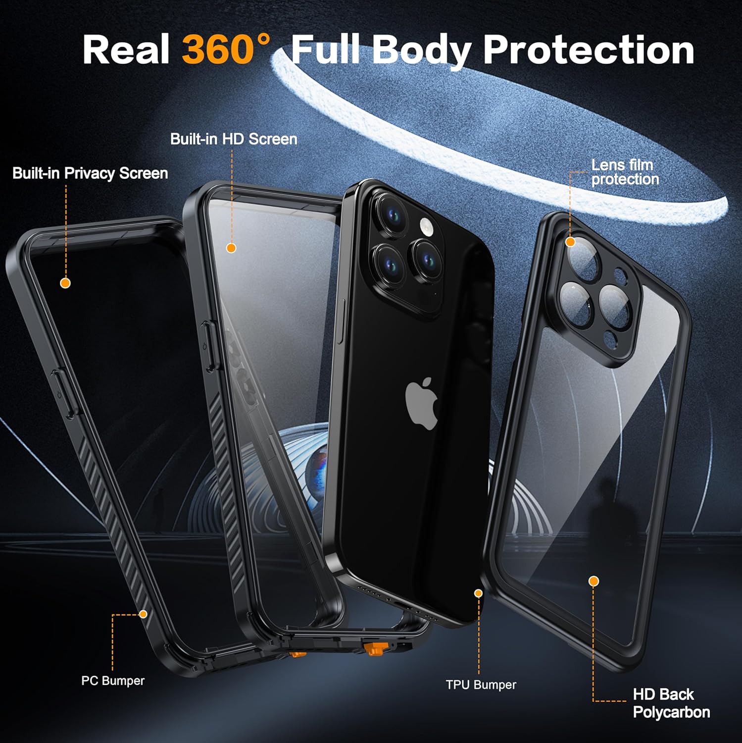 - 【360°Military Protection】The iPhone 15 Pro waterproof case is MIL-STD drop tested and survives drops from up to 14 FT. Two layers and bumper raised frame provide 360 degree rugged complete protection, protect your phone from bumps, dust, dirt and snow, easy to deal with everyday drop accidents.
