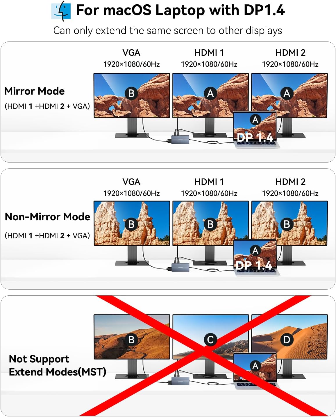- 4K Dual Monitor & Triple Display: The docking station can easily to achieve dual-monitor and triple-monitor displays for Windows. Single use HDMI port up to 4K@60Hz, VGA port up to 1080p@60Hz. Extend 2 monitors (HDMI+VGA): 4K@60Hz + 1080p@60Hz; (HDMI 1+HDMI 2): 4K@60Hz + 1080p@60Hz. Display output will be 1080p@60Hz when triple display. Note: macOS only supports mirroring mode (SST).