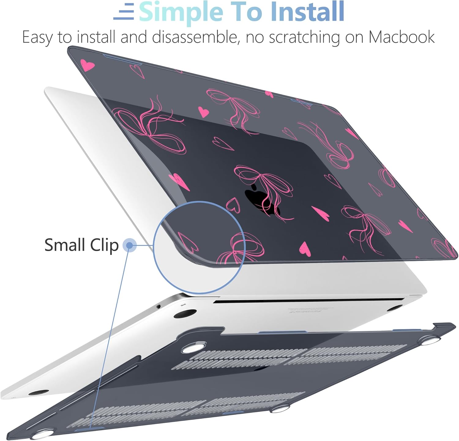 - Design Features of Case: The bottom case is designed with vents for maximum heat dissipation. The bottom case has non-slip feet to avoid slipping during use. The precise cutting design allows you to access all the ports of your MacBook. It is easy to install and remove
